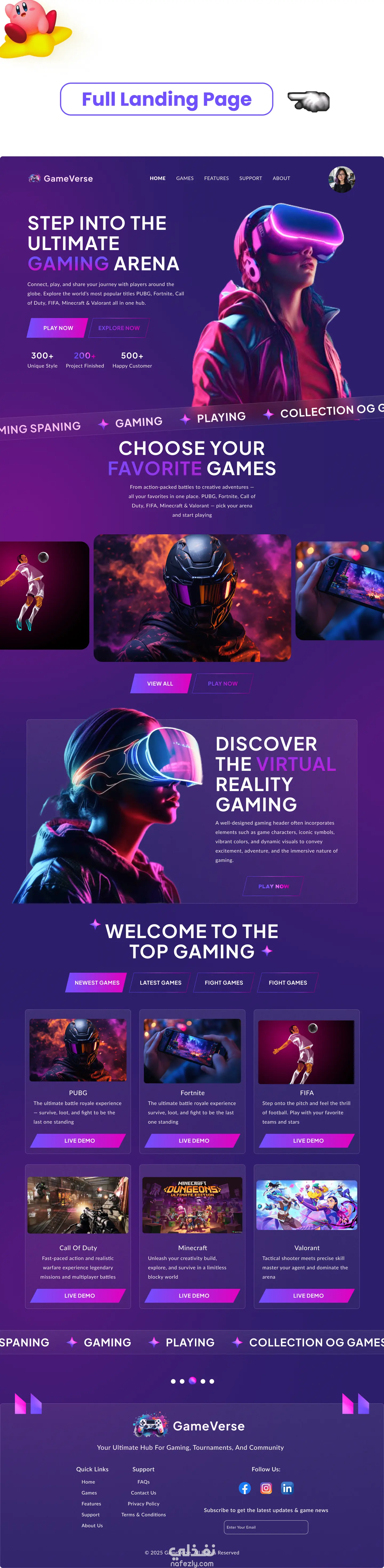 This project is a modern gaming landing page designed with a clean layout, bold visuals, and a dark theme. It highlights popular games like PUBG, Fortnite, Call of Duty, FIFA, Minecraft, and Valorant, with easy navigation and engaging sections to create an exciting user experience