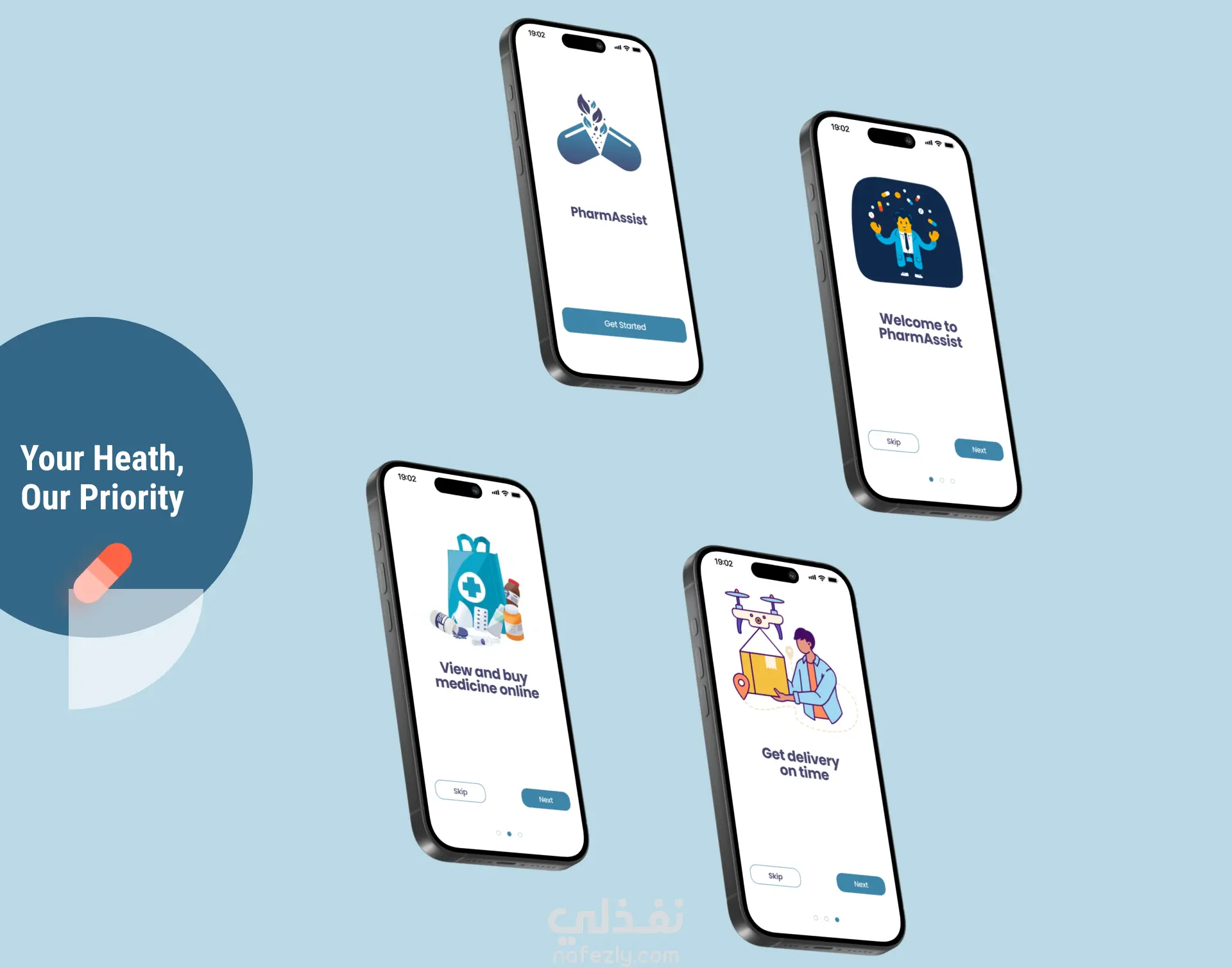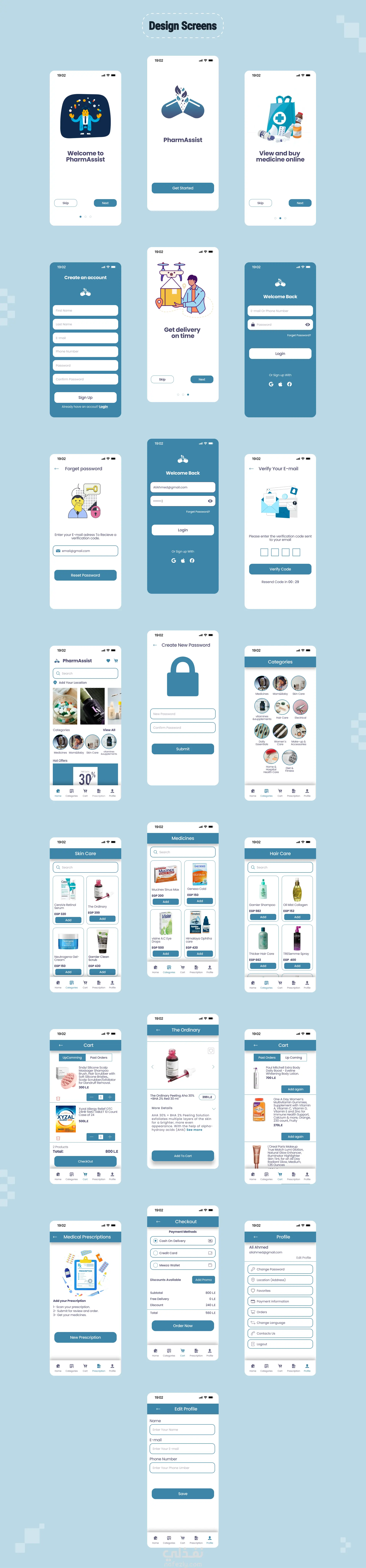 This is a mobile app design for PharmAssist, an online pharmacy. The design focuses on simple navigation, clean layouts, and helpful features like product browsing, prescription upload, and easy checkout to give users a smooth shopping experience