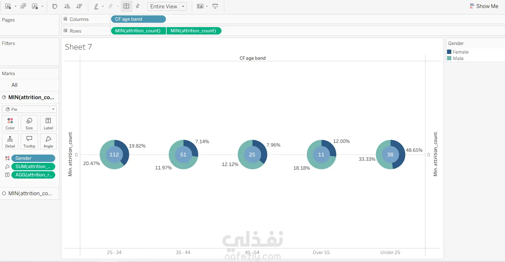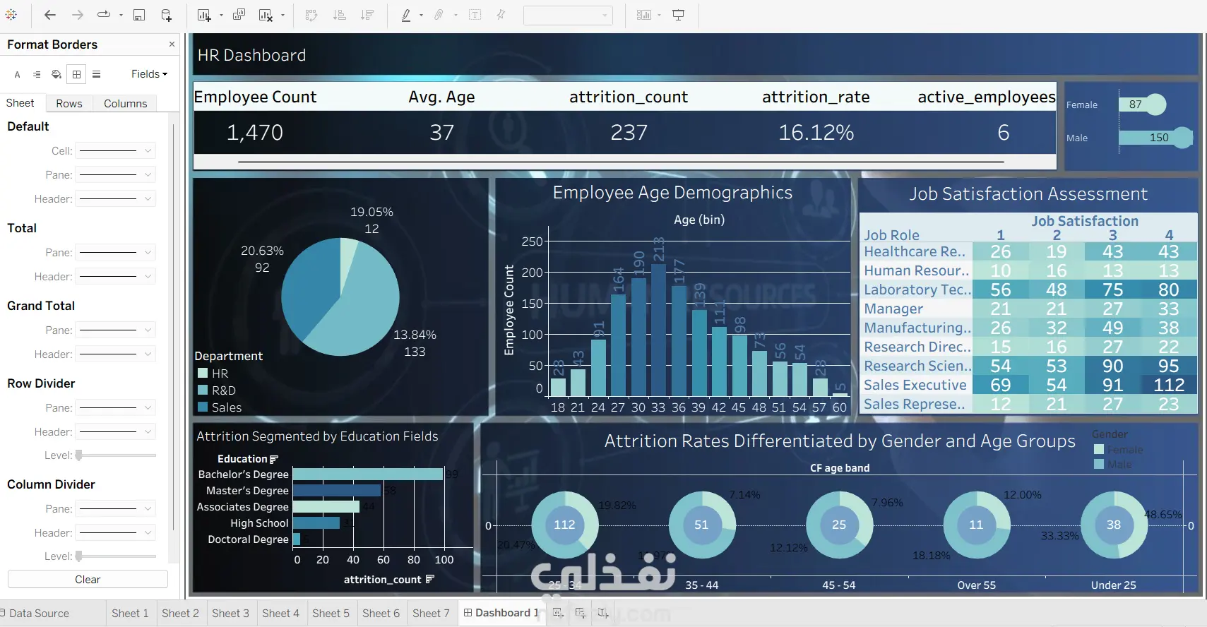 تحليل بيانات hr لمعرفة عدد المتقاعدين حسب مستوى التعليم ، نسبة التقاعد حسب الأعمار age groups / gender ، عدد الموظفين لكل قسم ، نسبة الرضا عن بيئة العمل حسب كل مسمى وظيفي . تصميم داشبورد بإستخدام Tableau