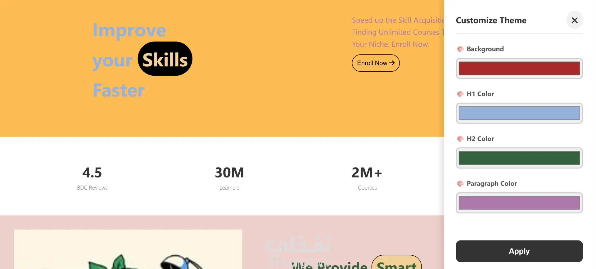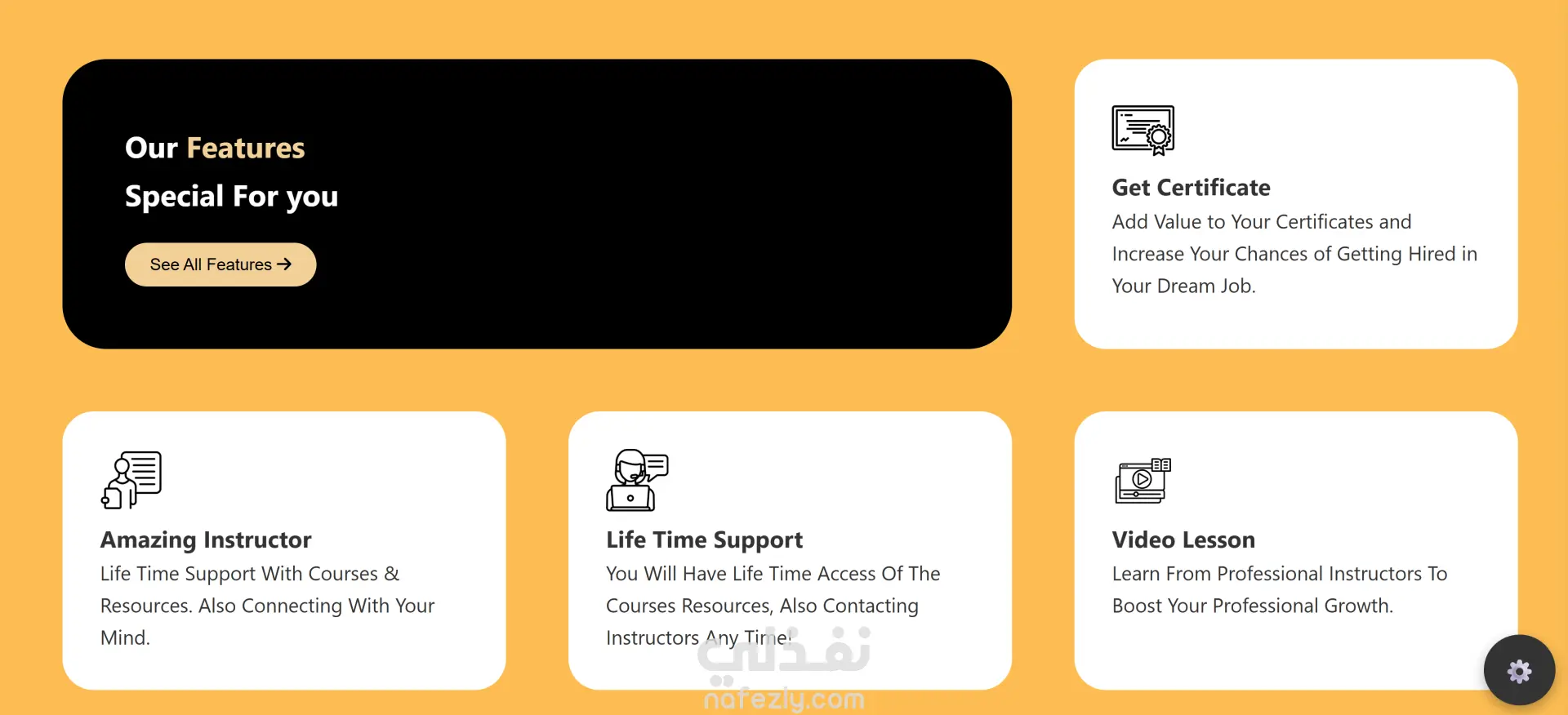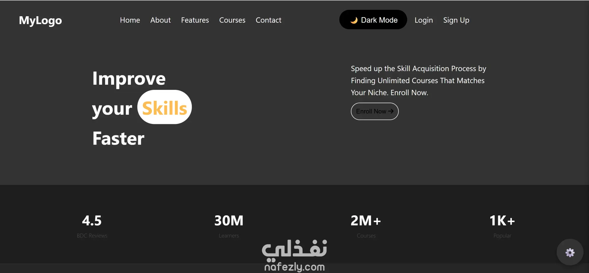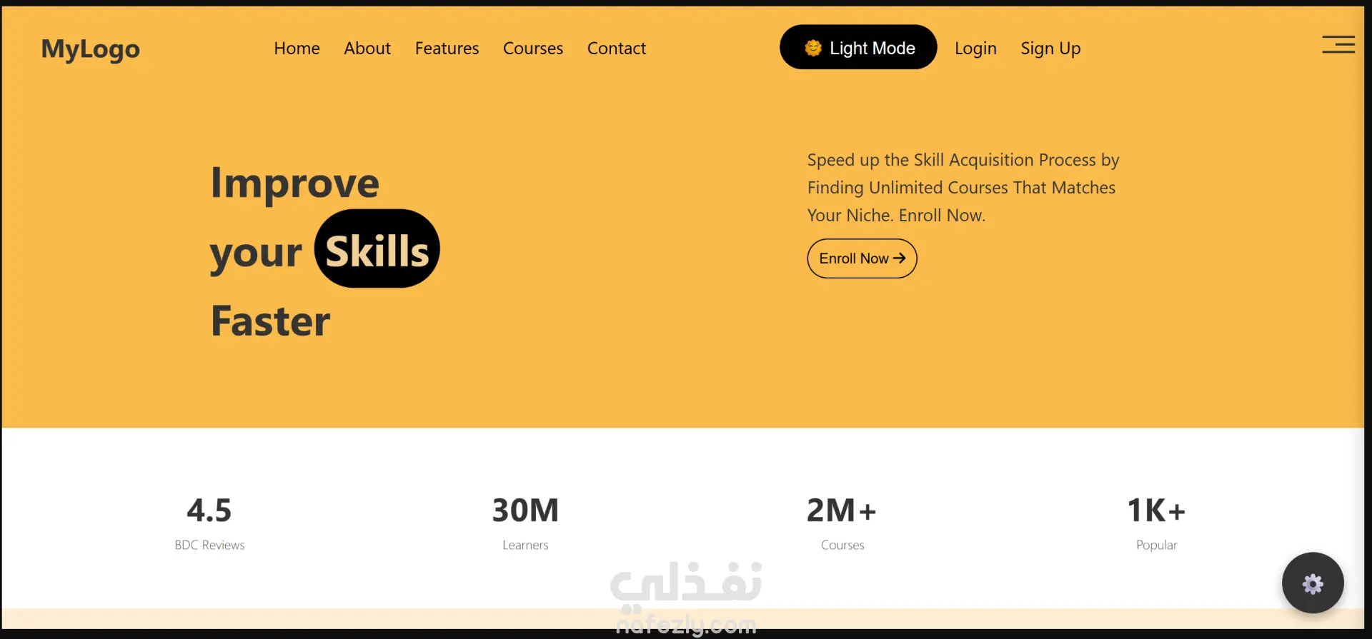 قالب واجهة أمامية احترافي ومصمم خصيصًا لمنصّات التعليم الإلكترونية (e-Learning). يعرض صفحات جذابة تشمل الأقسام مثل: الدورات، ميزات المنصة، المدربين، والتسجيل، مع دعم الوضع الفاتح وتفاعل سلس مع المستخدم. من خلال هذا القالب، يمكنك: تحويل التصميم إلى واجهة ويب حقيقية وسهلة الاستخدام. عرض الدورات والمحتوى بطريقة منظّمة وجذابة. ضمان تجربة مستخدم متجاوبة على الجوال والحاسوب. دمج مكونات تفاعلية مثل تسجيل الدخول، عرض الدورات، وخصائص إضافية كالمدربين والشهادات. تم تصميم هذا الموقع باستخدام : HTML - CSS-JavaScript