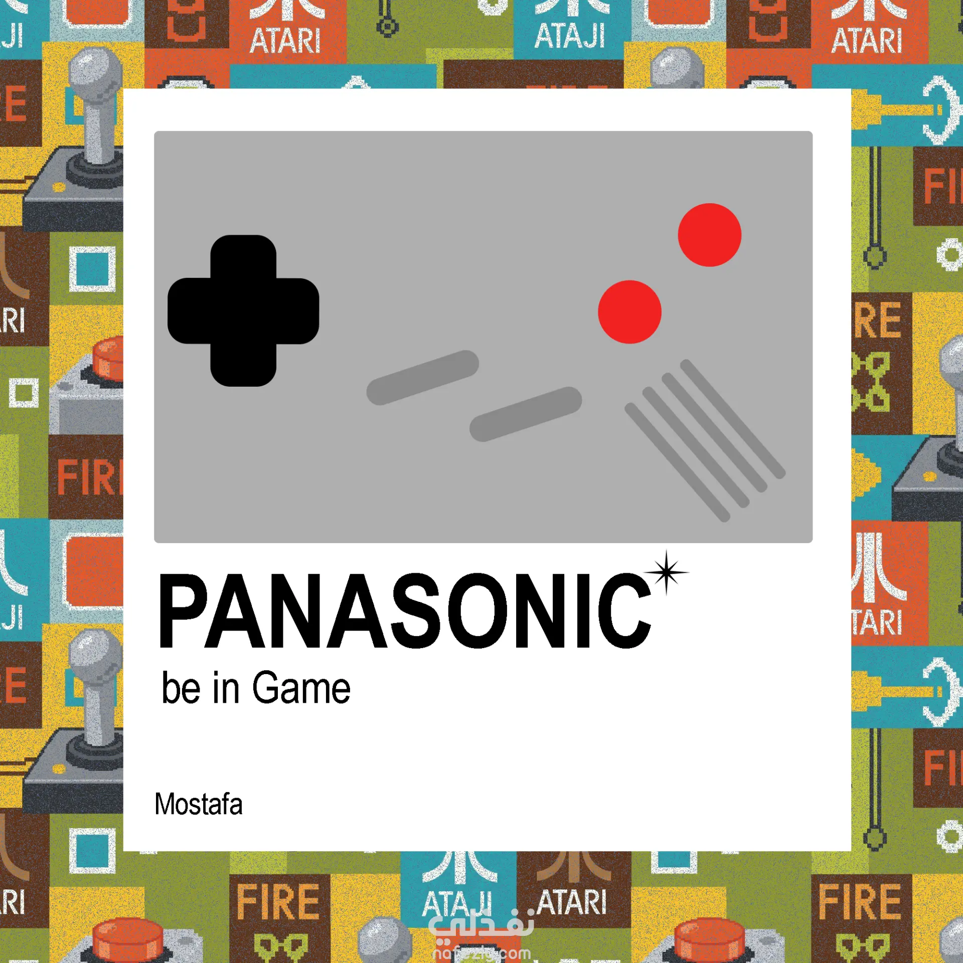 يعرض التصميم واجهة تحاكي يد تحكم الألعاب القديمة بتفاصيل بسيطة وألوان متناسقة، مع دمج شعار PANASONIC وشعار تسويقي مبتكر "be in Game" ليعبر عن الاندماج في عالم الألعاب الإلكترونية.