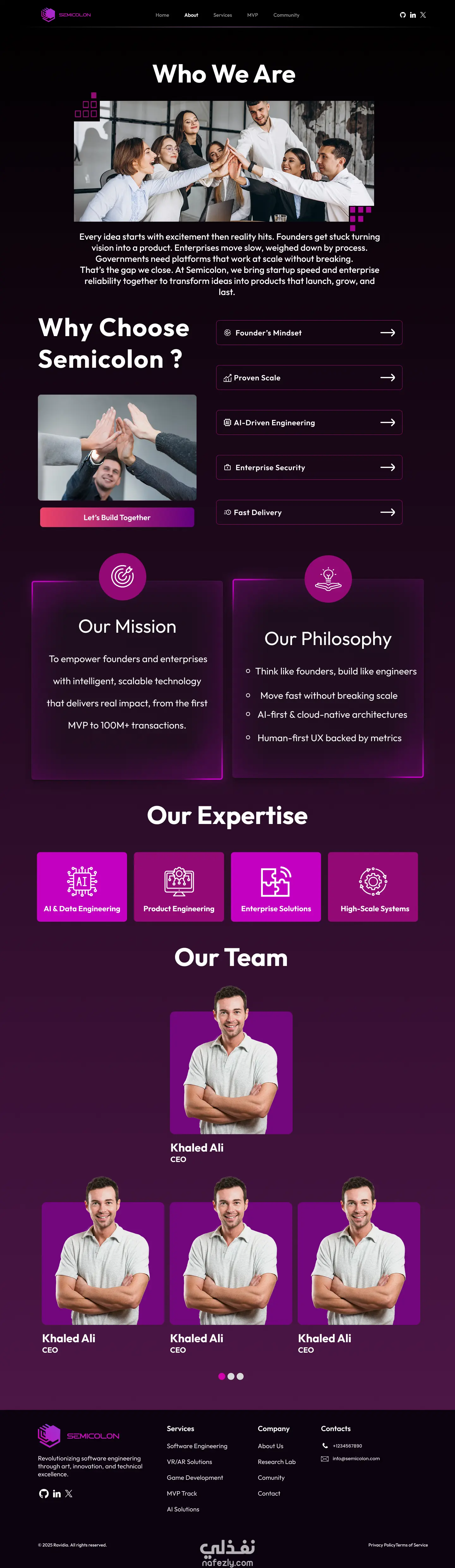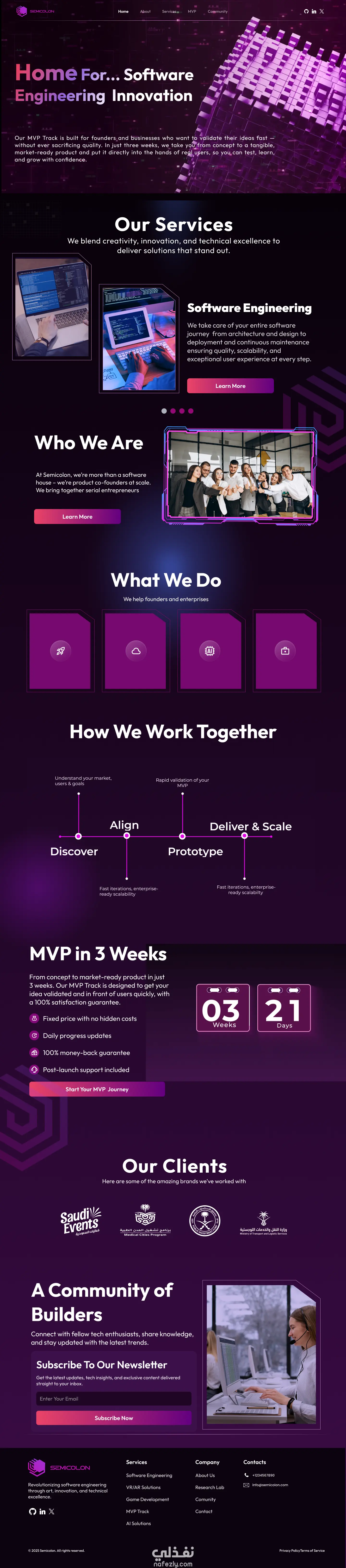 تم تطوير وتصميم الموقع الإلكتروني لشركة Semicolon ليعكس هويتها كشركة مبتكرة في مجال تطوير البرمجيات والذكاء الاصطناعي. الموقع يركز على إبراز الخدمات المقدمة مثل هندسة البرمجيات، حلول الـ MVP السريعة، ودعم رواد الأعمال. التصميم اعتمد على هوية بصرية عصرية بألوان جريئة، مع عرض واضح للخدمات، قصة الشركة، العملاء، وآلية العمل، مما يعكس الطابع التقني والإبداعي للشركة