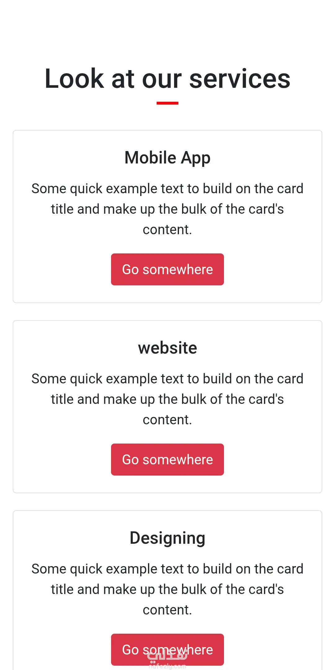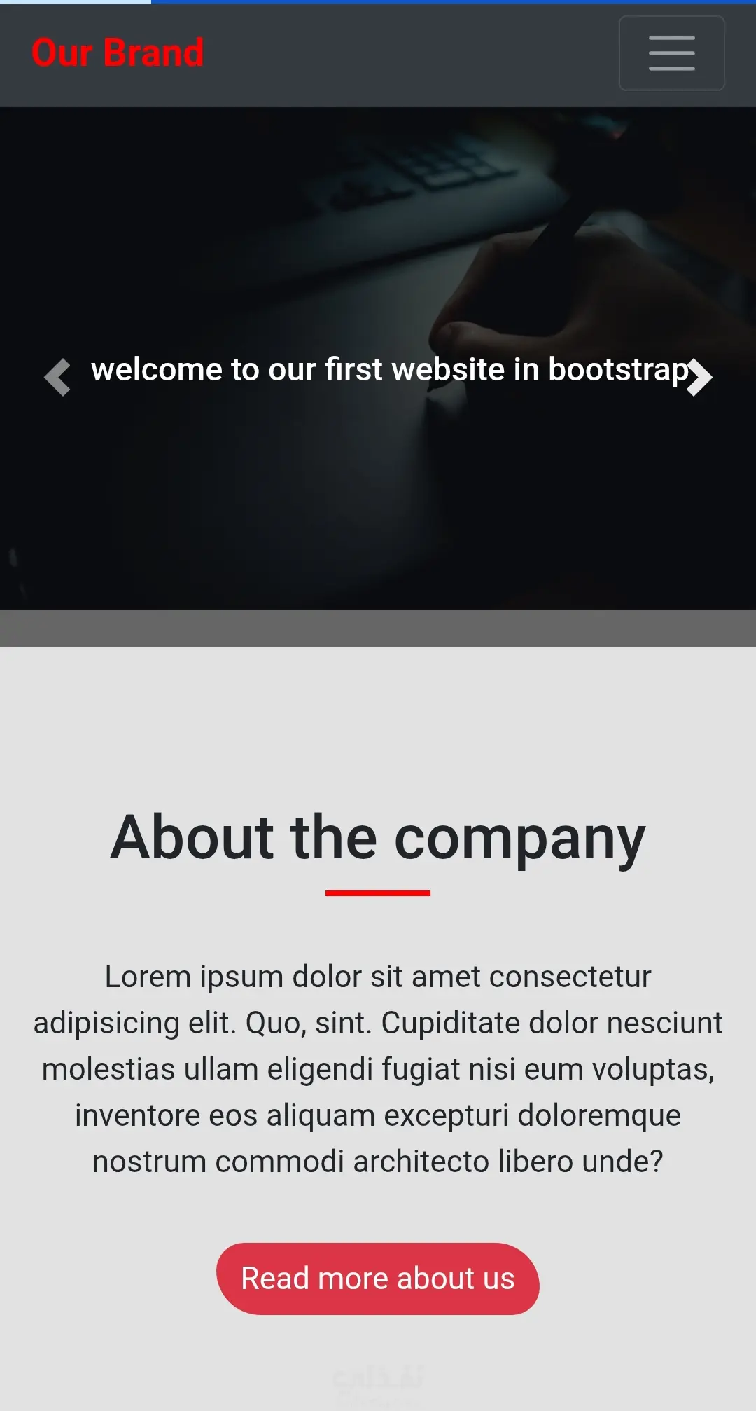موقع بوتستراب متوافق مع كل الشاشات موقع تجريبي استخدمت html , css ,bootstrap 4 في عمل الموقع الموقع يحتوي على القائمه الاساسيه (الصفحه الرئيسيه -من نحن -تواصل معنا ) و 3 صور يحركهم الضغط على الاسهم و فقرة تعريف و الخدمات المقدمه مع الصور و فوتر بهم ايقونات التواصل عبر السوشل ميديا