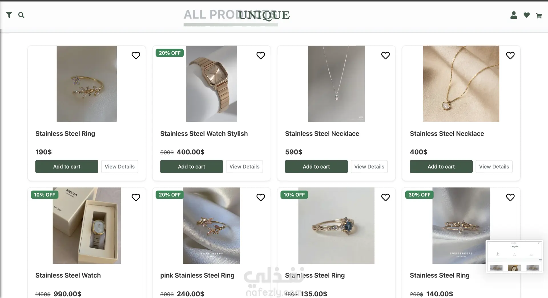 تم إنشاء موقع ويب ستاتيك أنيق ومتجاوب لعرض المنتجات بطريقة منظمة وجذابة. يتكون الموقع من صفحات رئيسية وهي: Home – Products – Contact Us – Favorites – Cart، وكل صفحة مصممة بعناية لتوفير تجربة استخدام مريحة وسلسة على مختلف الأجهزة (كمبيوتر، تابلت، وموبايل). تم تنفيذ التصميم باستخدام HTML، CSS، JavaScript، وBootstrap لضمان سرعة الأداء، وتناسق الألوان، وتحسين تجربة المستخدم بشكل عصري واحترافي. الموقع يتميز بتصميم بسيط وحديث يعكس هوية المشروع ويُسهِّل تصفح المنتجات والتفاعل مع المحتوى.