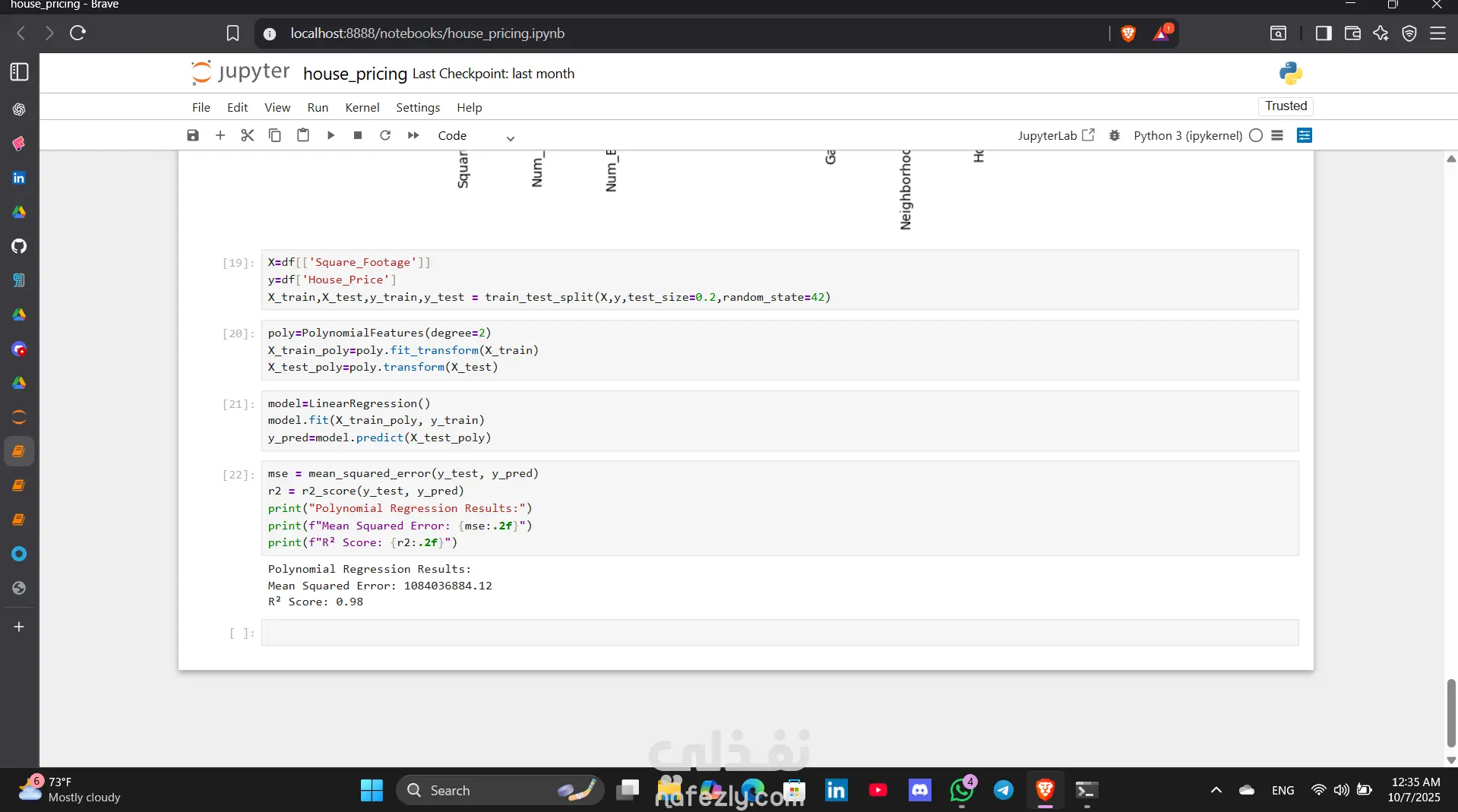 Analyzed housing dataset with scatterplots, barplots, and heatmaps. Applied Polynomial Features (degree=2) for non-linear modeling. Trained a Linear Regression model. Evaluated with Mean Squared Error (MSE) and R² score.