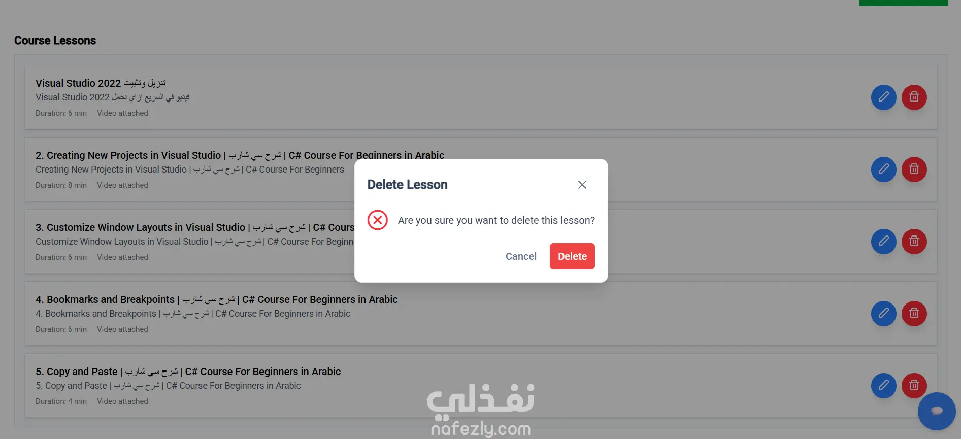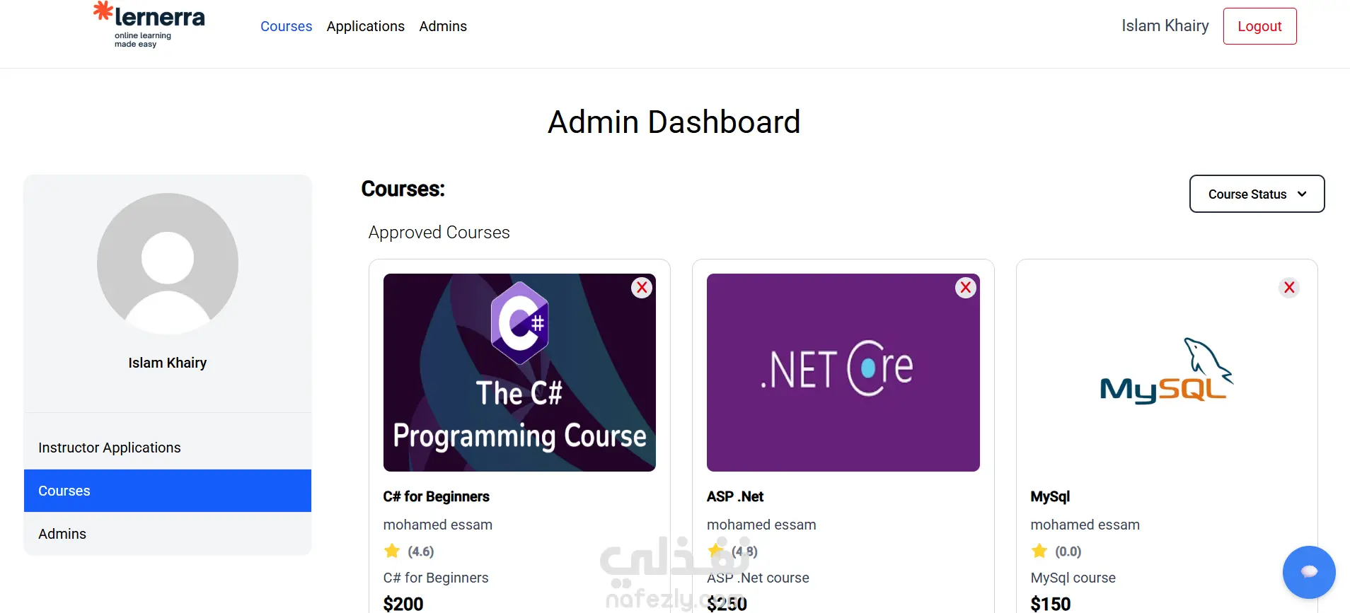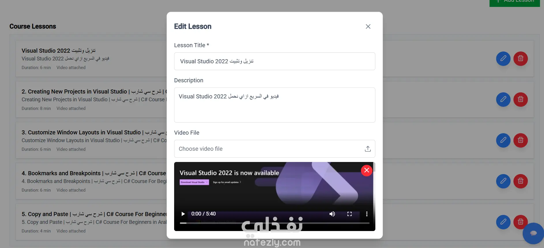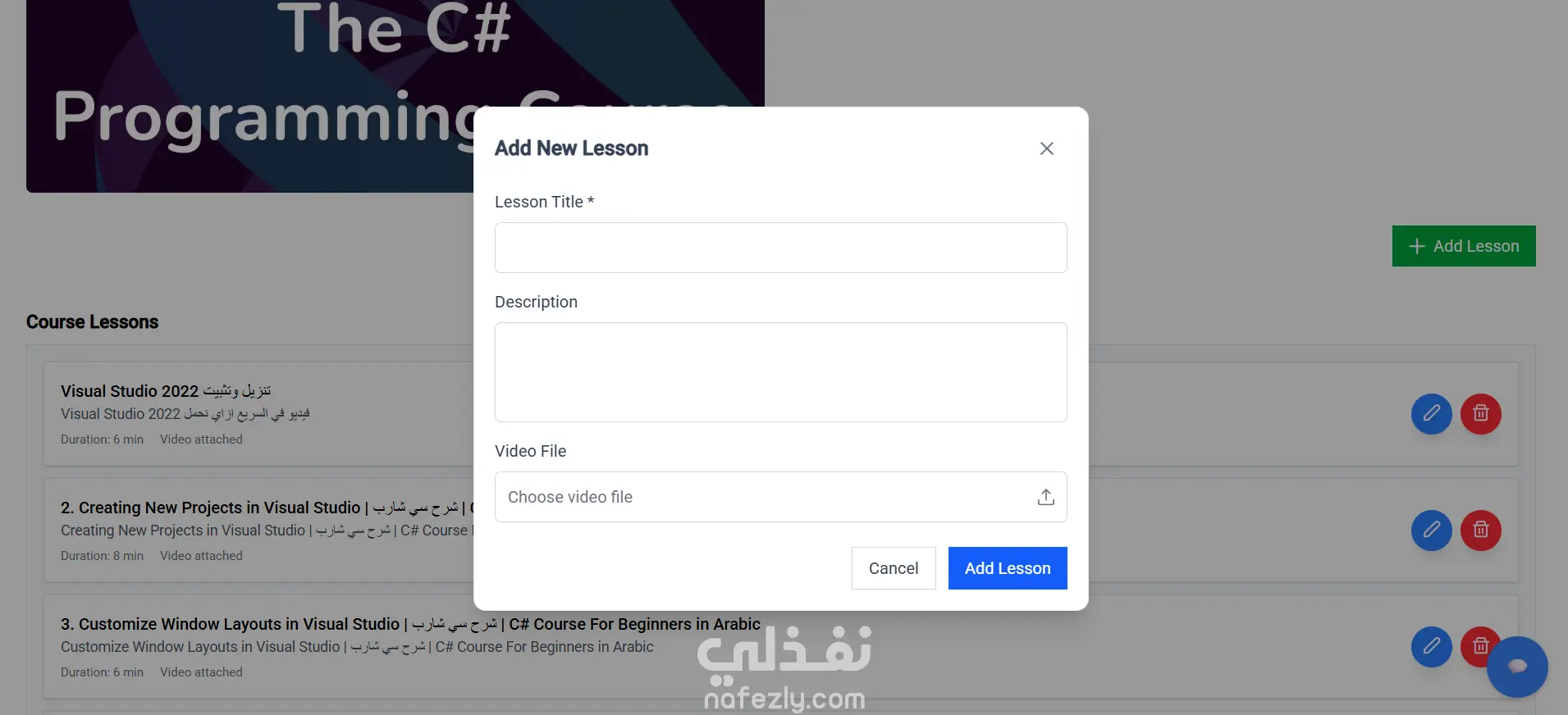• إدارة كاملة للدورات والدروس (إضافة، تعديل، حذف)