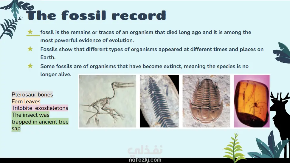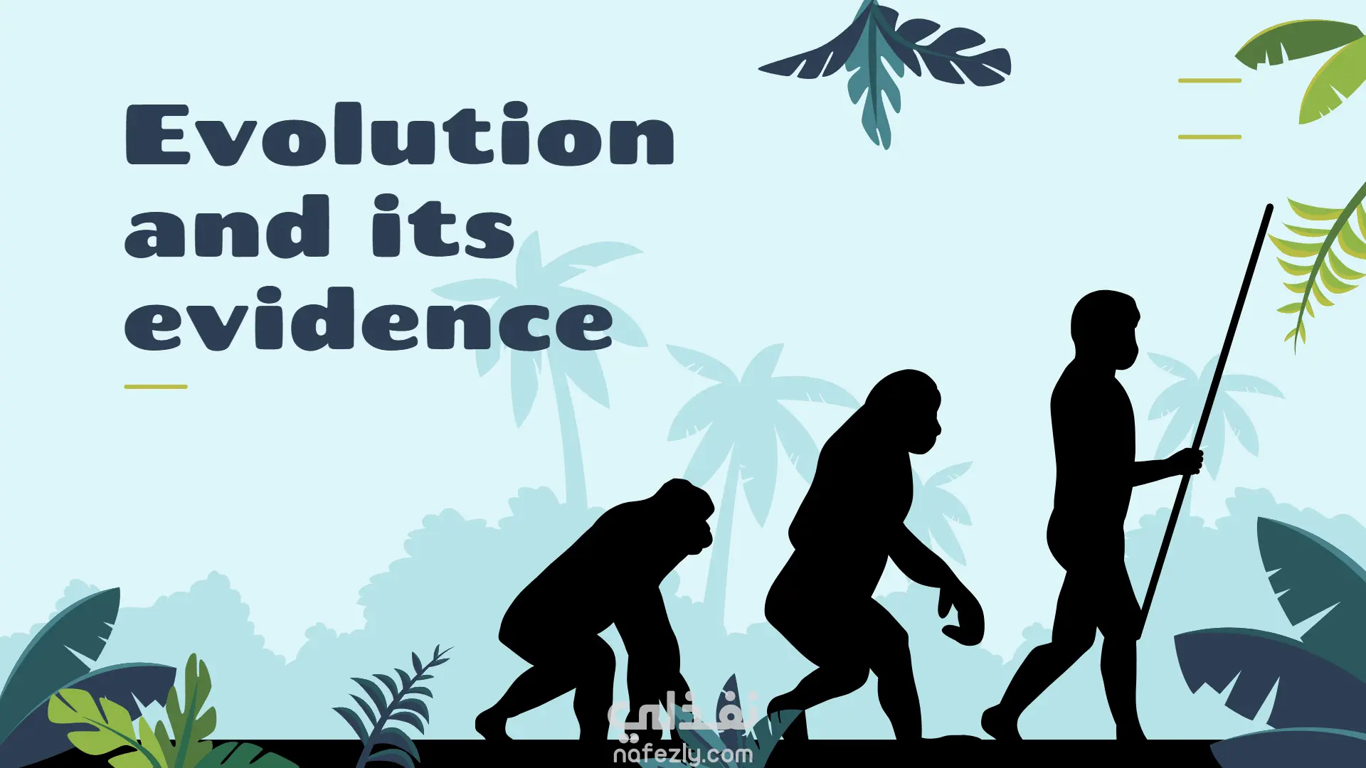 عرض تقديمي يتحدث عن "Evolution and its evidence " يتضمن مواضيع: 1- Natural selection 2-Strata 3- The fossil record 4- The age of fossils 5- The distribution of fossils 6- Transitional species
