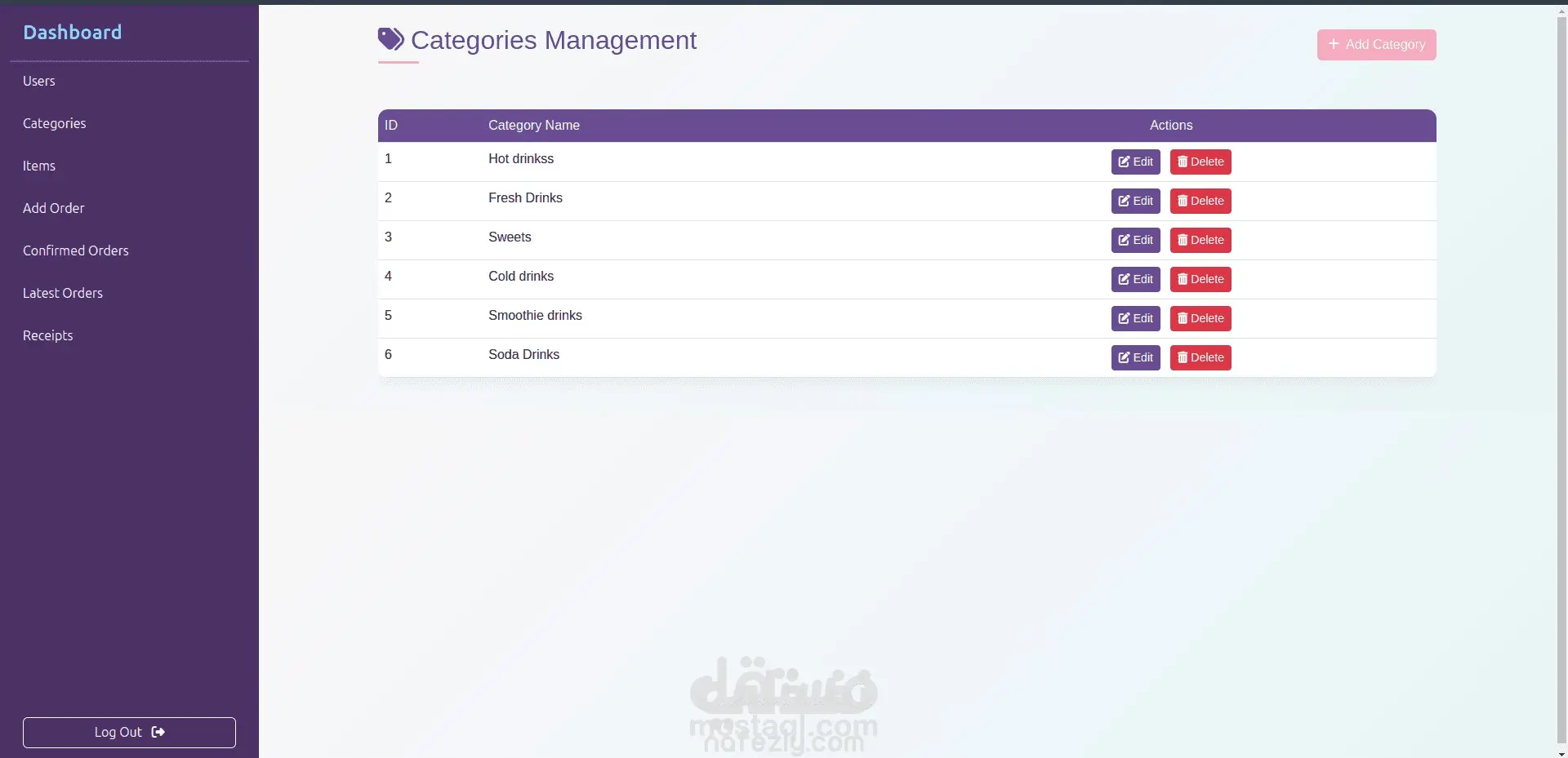 لوحة تحكم للمسؤول (Dashboard): يمكن من خلالها إدارة الأصناف، ومتابعة الطلبات، وتحديث حالة كل طلب (مثل: قيد الانتظار، قيد التحضير، تم التوصيل)، بالإضافة إلى إمكانية عرض التقارير وطباعة الفواتير.