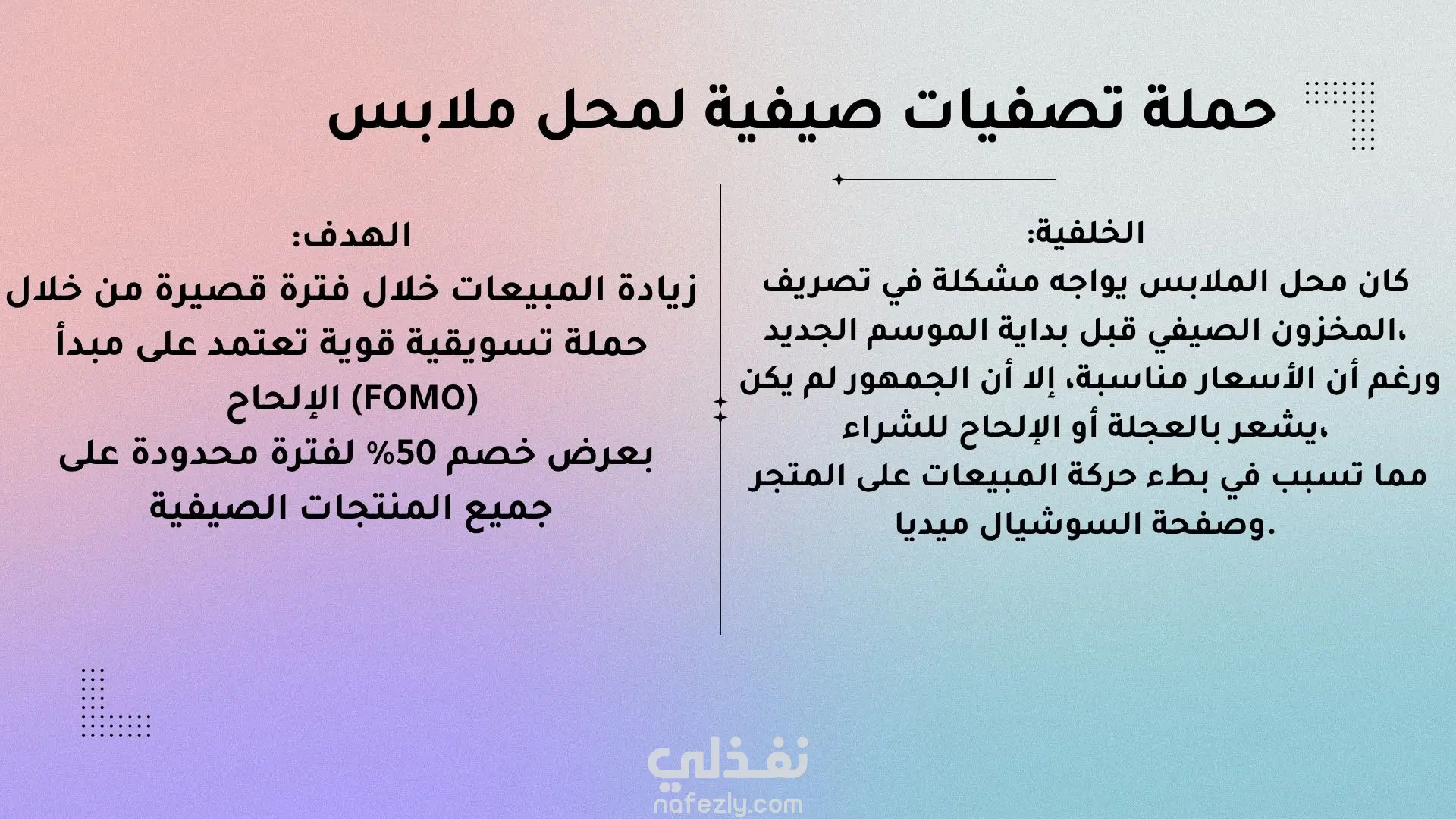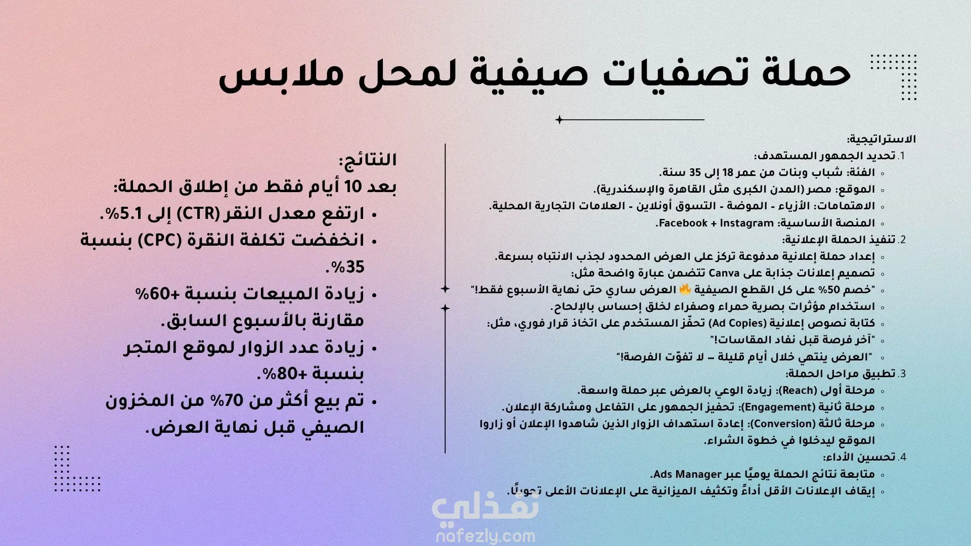 الاستراتيجية (FOMO Marketing): استخدام أسلوب “الخوف من فوات الفرصة”. إنشاء حملة “Sales Conversion”. إعداد إعلان بعرض محدود زمنيًا (خصم 50% لمدة 3 أيام). النص الإعلاني المستخدم: خصم 50% لفترة محدودة على جميع القطع الصيفية! إلحق الفرصة قبل نفاد الكمية تسوّق الآن من موقعنا واحصل على توصيل مجاني لأول طلب. النتائج (خلال أسبوع): 3,700 وصول (Reach). 290 نقرة للموقع. CTR بنسبة 8.2%.
