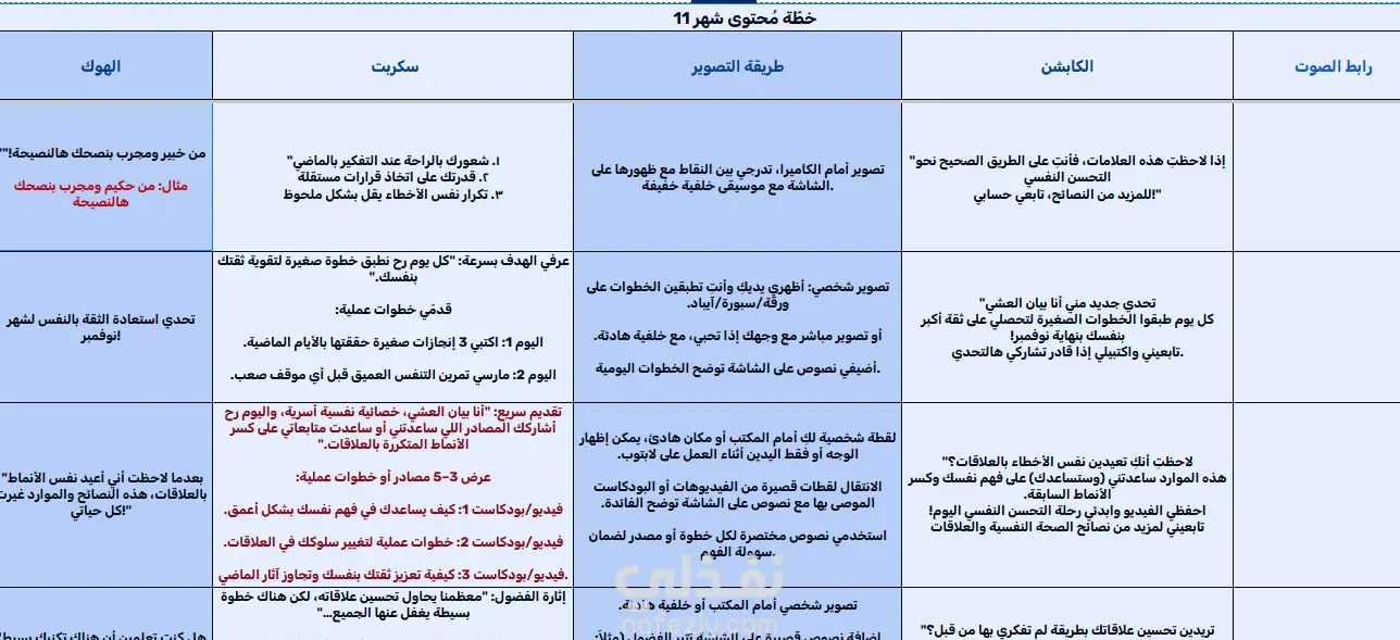 خطة محتوى لشهر نوفمبر لأحد العملاء، الخطة خاصة بريلزات وستوريات عبر الانستقرام تتضمن 30 فكرة لمدة شهر تم تطبيقها والعمل عليها بدأ من نوفمبر، وحصلت العميلة على النتائج المرجوة بحمد الله.