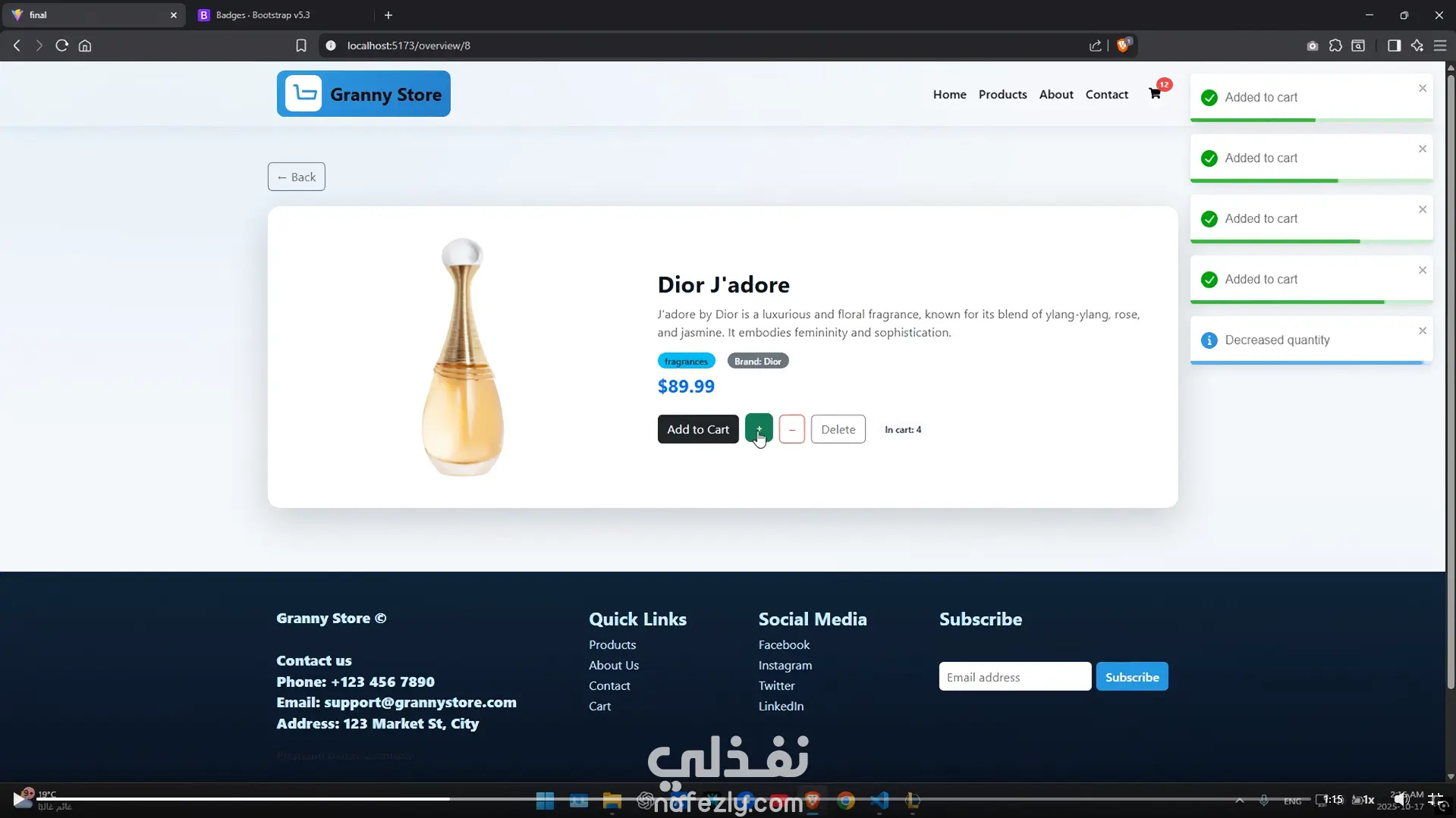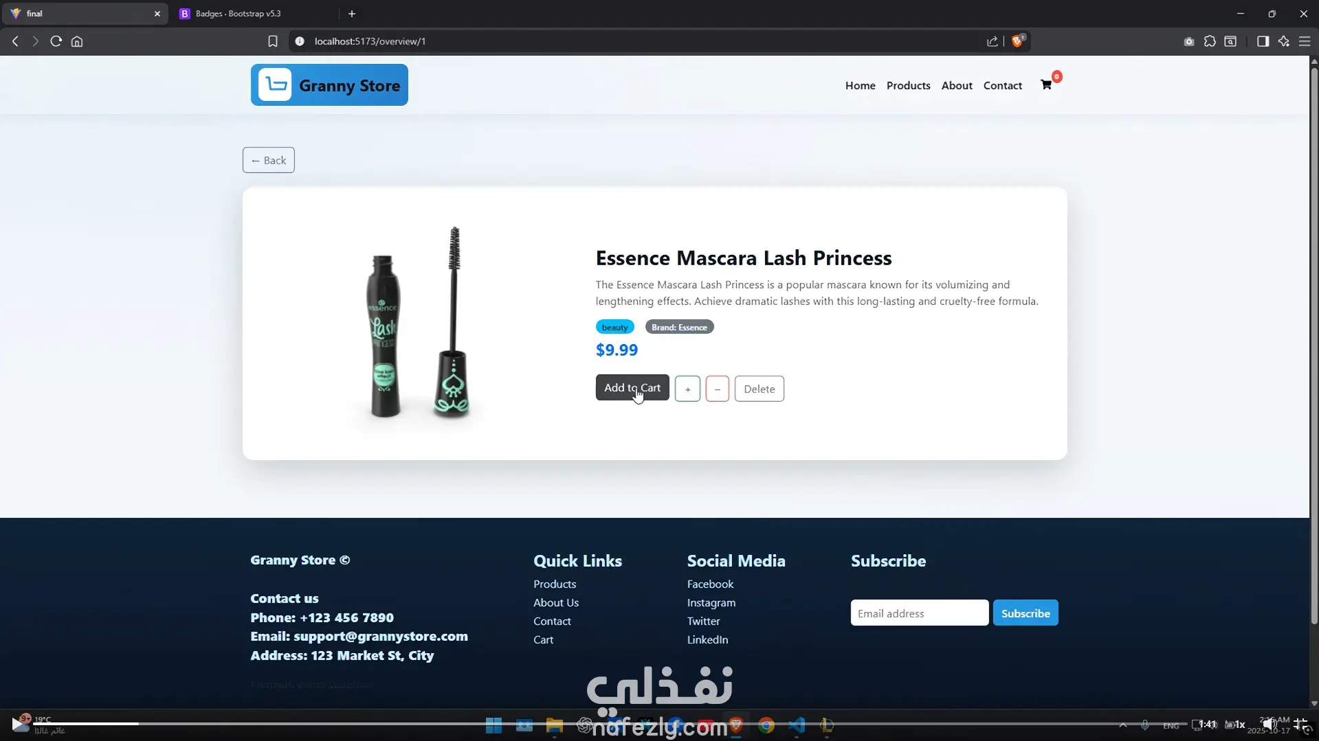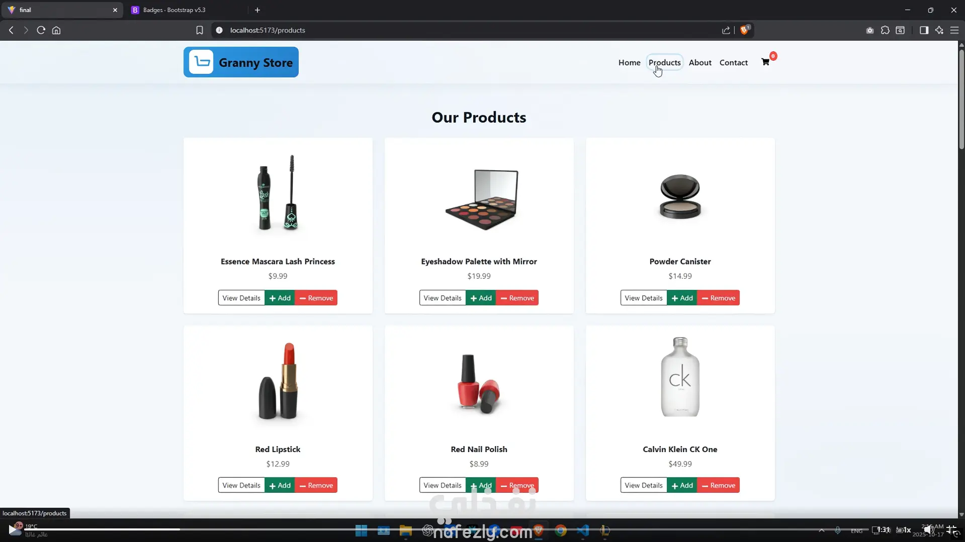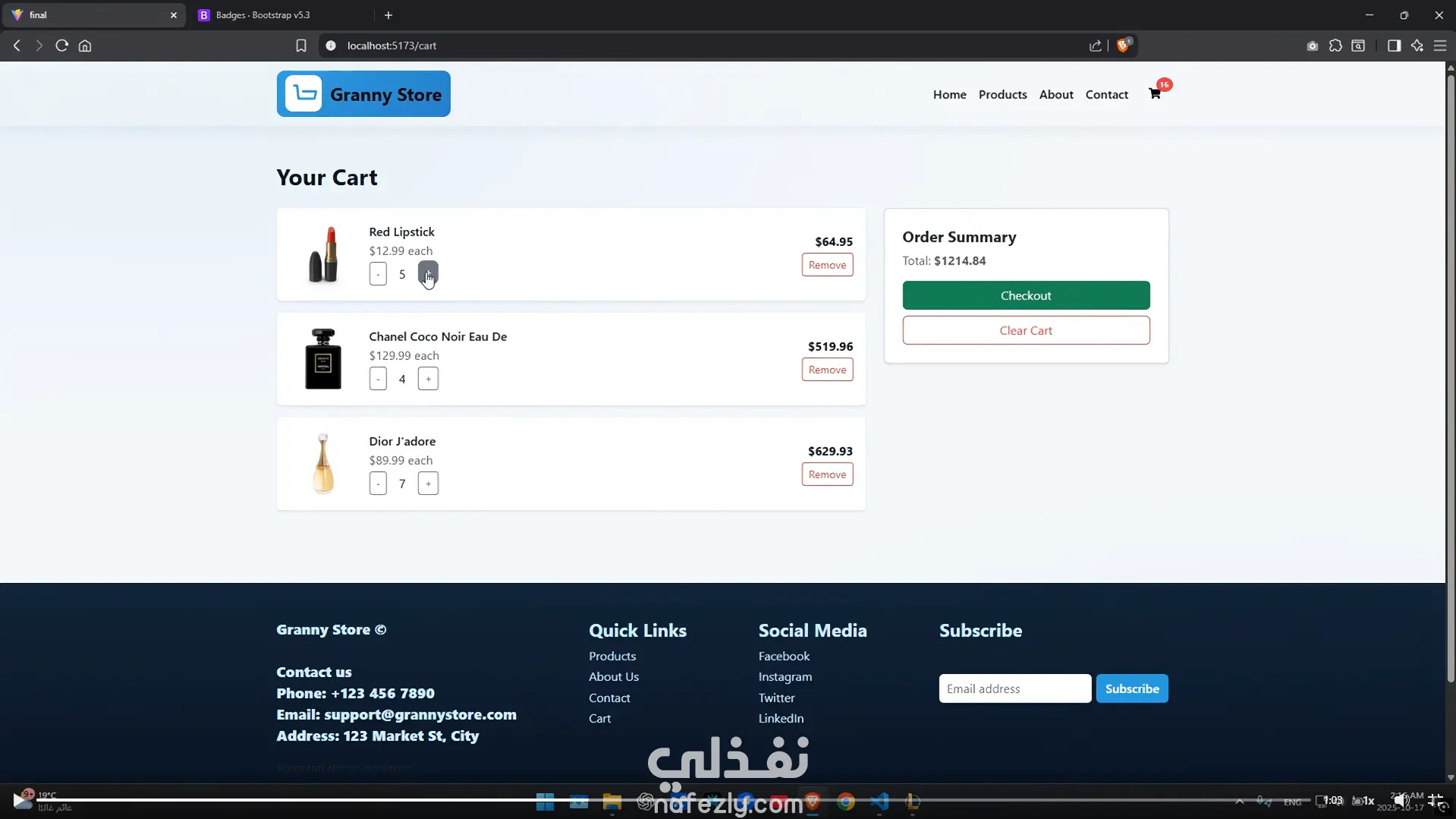 - حطيت Cart كاملة وFully-functional تقدر تضيف منتجات ليها، وعداد المنتجات بيشتغل synchronized مع الويبسايت ككل، تقدر تزود منتجات او تنقص ولو وصلت لصفر المنتج هيتحذف، وفيه اوبشن انك تعمل clear للكارت كلها، وطبعا زرار للcheckout.