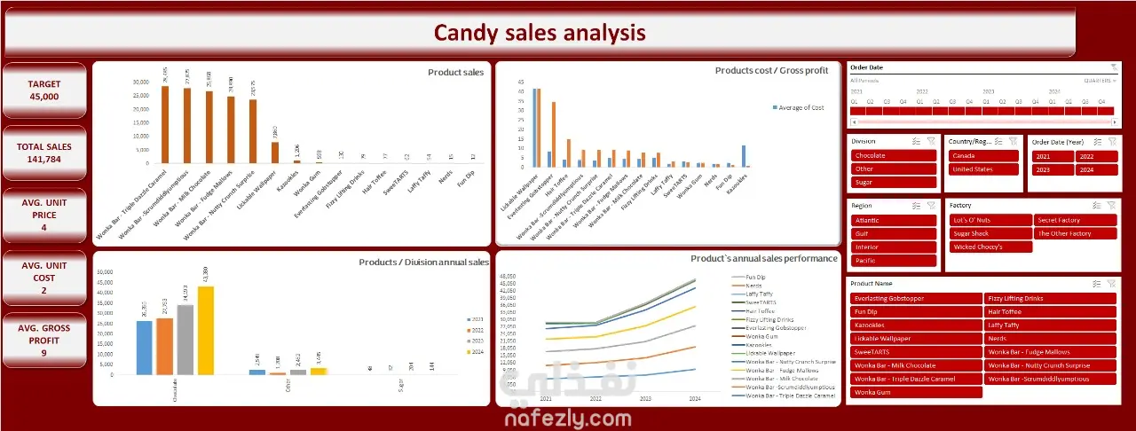 سلسلة لوحات التحكم هذه تقدم تحليلًا شاملًا لأداء مبيعات الحلويات السنوي عبر المناطق الجغرافية والمنتجات والأقسام والفئات المختلفة من العملاء. بدأ العمل بجمع البيانات من عدة مصادر، تلاها تنظيف البيانات ودمجها وتحويلها لضمان الدقة والاتساق. تم تحليل مجموعات البيانات باستخدام جداول PivotTables مخصصة وتصميمات مرئية متقدمة في Excel لاستخراج رؤى قابلة للتنفيذ ودعم القرارات الاستراتيجية. * أبرز النتائج والتحليلات إجمالي المبيعات: 141,784 وحدة مقابل هدف 45,000، أي تجاوز الهدف بنسبة تزيد عن 215%. منتجات الشوكولاتة هي الأكثر مبيعًا. منطقة المحيط الهادئ تتصدر من حيث عدد العملاء والمبيعات وإجمالي الأرباح. خدمة الشحن القياسية (Standard Class) هي الأكثر استخدامًا بنسبة 60%. مصنعا "Lot’s O’ Nuts" و"Wicked Choccy’s" يحققان أعلى إيرادات. تُمكّن لوحات التحكم الجهات المعنية من: مراقبة مؤشرات الأداء الرئيسية (KPIs) مقابل الأهداف في الوقت الفعلي. تحديد المنتجات والمناطق الأعلى أداءً لتركيز جهود التسويق والتوزيع عليها. اكتشاف المنتجات منخفضة الأداء لتقييم جدوى استمرارها أو دعمها بحملات ترويجية. فهم العلاقة بين أنماط الشحن وحجم المبيعات. دعم اتخاذ القرارات الاستراتيجية المتعلقة بالإنتاج والتسعير والتوسع في الأسواق.