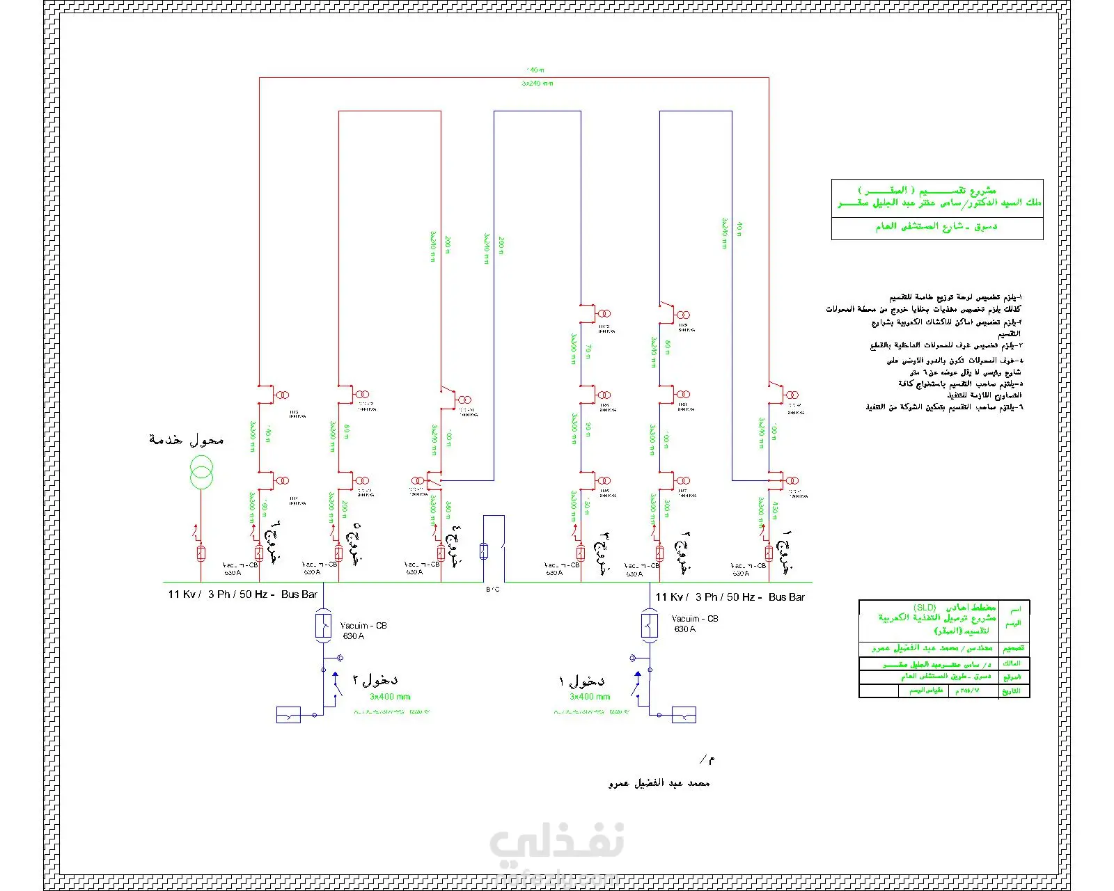 مشروع: تصميم شبكة الكهرباء الخارجية لتقسيم الصقر – مدينة دسوق قمت بتصميم شبكة الكهرباء الخارجية للجهد المتوسط لتقسيم الصقر، وهو كومباوند كبير على مساحة 17 فدان تقريبًا (≈65,843 م²)، مقسم إلى 48 قطعة تشمل مدرسة لغات، مستشفى خاص، مول تجاري، و42 برجًا سكنيًا وتجاريًا. يقع المشروع بمدينة دسوق وهي مدينة تجارية نشطة، ويتميز بموقعه الاستراتيجي بجوار المستشفى العام وقريب من وسط المدينة، مما يرفع من أهمية المشروع. الأعمال التي قمت بها: تقدير الأحمال الكهربائية لكل قطعة من قطع التقسيم. حساب إجمالي الأحمال المتوقعة للتقسيم، والتي بلغت 14 ميجا فولت أمبير. تصميم موزع جهد متوسط لتغذية التقسيم بالجهد المتوسط 12 ك.ف مكون من 15 خلية (4 خلايا دخول + 8 خلايا خروج + 2 خلية ربط + خلية خدمة). تصميم كابلات الدخول لتغذية لوحة التوزيع بقطاع 3×400 مم² ألمنيوم، جهد 12/18 ك.ف، عدد 4 كابلات بطول إجمالي 9,600 متر. تصميم كابلات الخروج لتغذية المحولات بقطاعات 3×240 و3×150 مم² ألمنيوم، جهد 12/18 ك.ف، عدد 8 مغذيات خروج بطول إجمالي حوالي 3,200 متر. تصميم محطات التوزيع بعدد 15 محول بجهد 10,500/400 فولت وقدرات 800 و1000 ك.ف.أ. تصميم شبكة الجهد المنخفض لتغذية قطع التقسيم المختلفة بالتيار الكهربائي. تصميم شبكة إنارة الشوارع الخاصة بالتقسيم. قمت بتصميم محطة انتاج كهرباء من الطاقة الشمسية PV لتغذية المدرسة بالتيار الكهربي قدرة 15 كيلو وات المخرجات المرفقة SLD , DWG ,حسابات احمال EXCEL