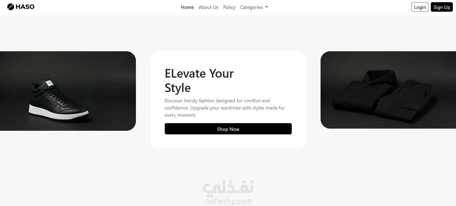 يقدّم الموقع صفحة هبوط تفاعلية (Landing Page) بتصميم عصري ومتجاوب مع جميع الأجهزة، ويعرض مجموعة من الفئات مثل القمصان، والبناطيل، والأحذية الرياضية.