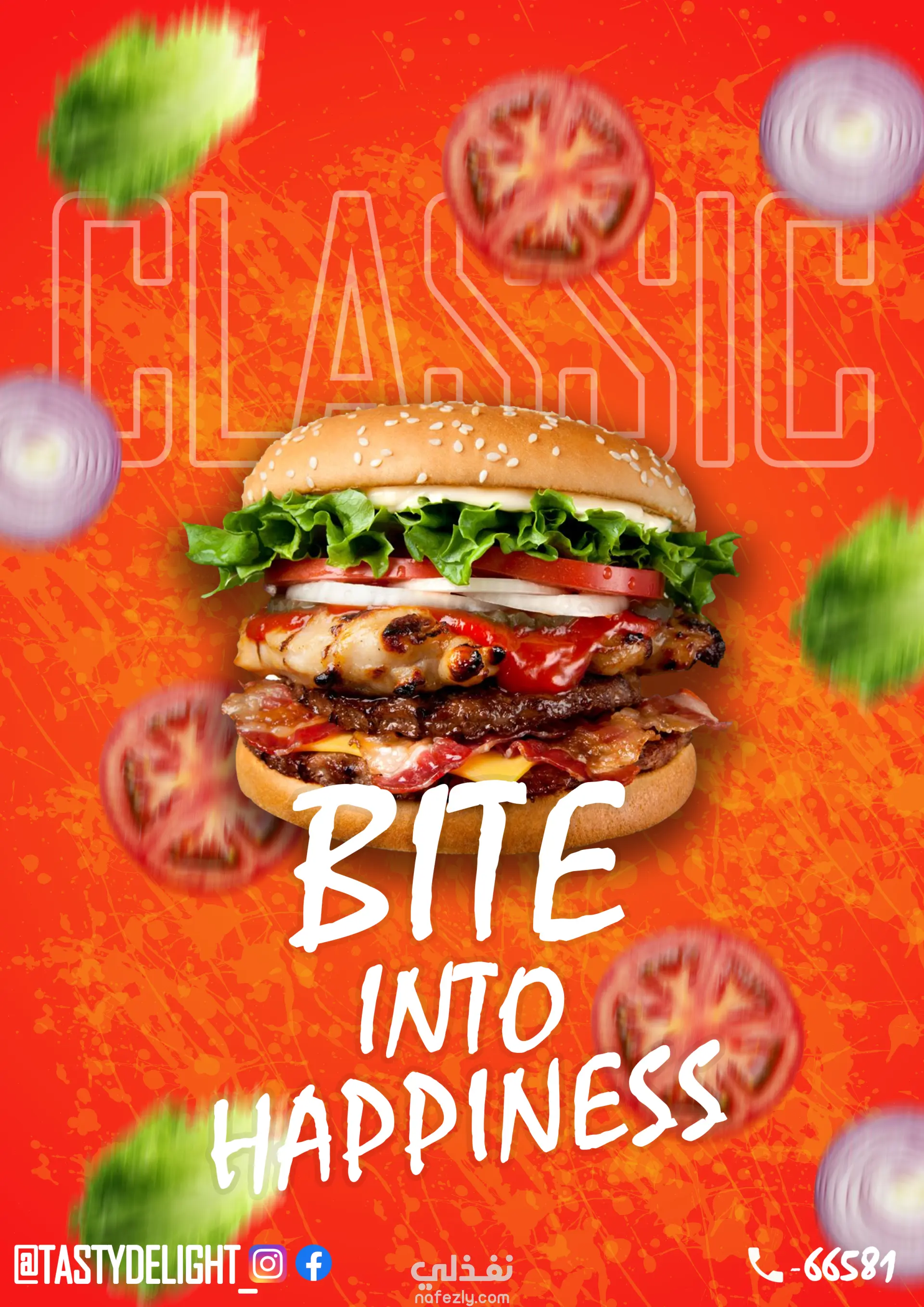 احدث عمل لي, قمت بتصميم هذا الإعلان الحيوي للترويج لبرجر كلاسيك باستخدام الشعار "Bite into Happiness". اعتمدت على خلفية حمراء–برتقالية مليئة بالحيوية والحركة لخلق جو مليء بالطاقة يجذب الانتباه مباشرة. وزعت مكونات طازجة مثل الخس والطماطم والبصل بشكل ديناميكي حول البرجر لإبراز الطزاجة وجودة المكونات. أما العنصر الأساسي في التصميم فهو البرجر العصير متعدد الطبقات، الذي يظهر بشكل شهي ولا يقاوم. استخدمت خطًا عفويًا ولافتًا ليعكس المرح والبهجة، مع إضافة وسائل التواصل الاجتماعي ورقم التواصل لإكمال الجانب التسويقي وجعل التصميم فعالًا وجذابًا.