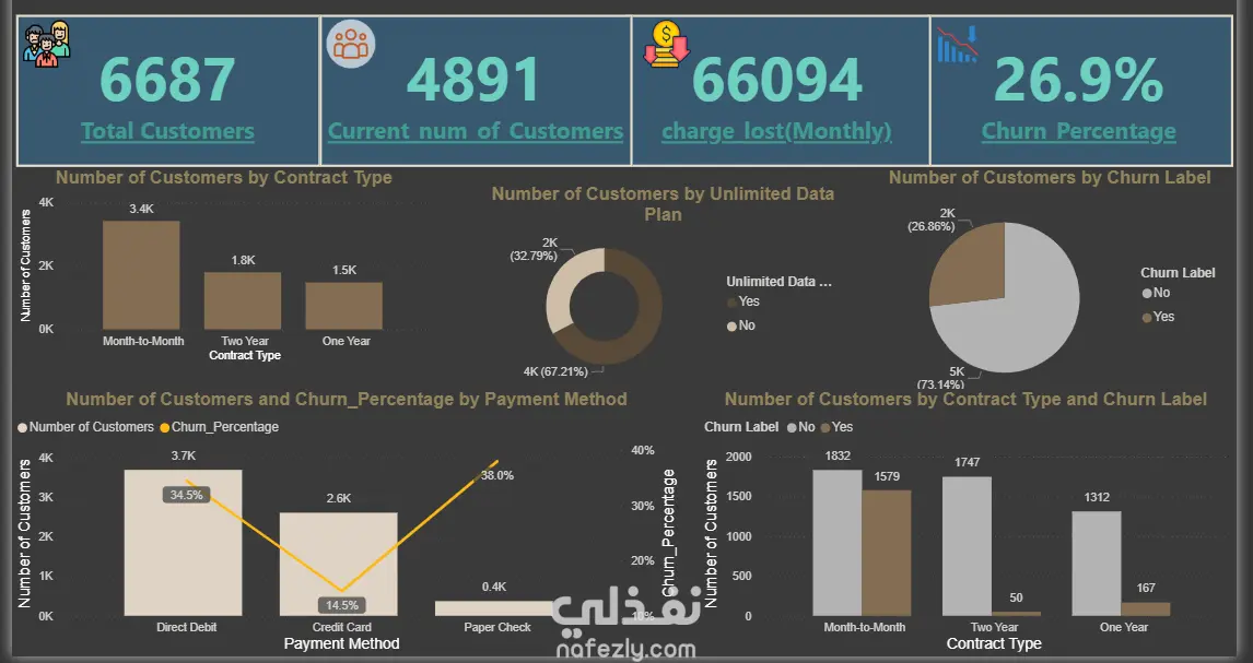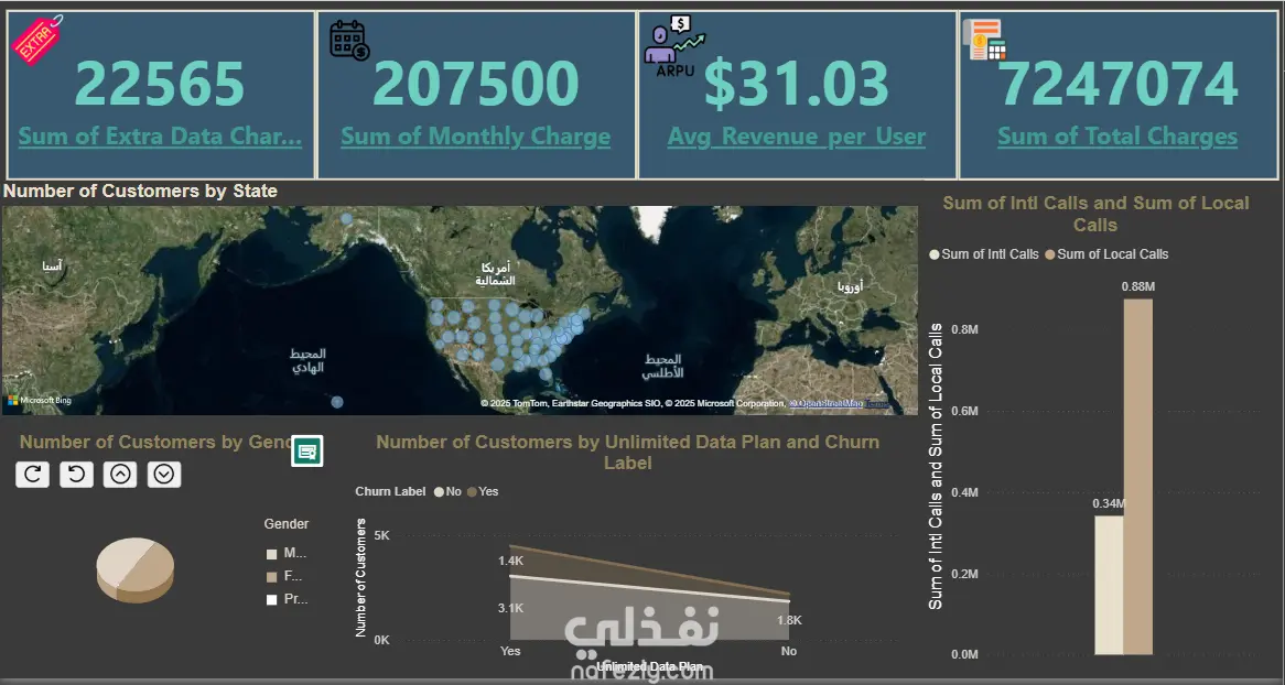 يقدم هذا المشروع تحليلًا شاملًا لمعدل فقدان العملاء (Churn) داخل شركة اتصالات، بالاعتماد على بيانات متنوعة تشمل: النوع، الباقات الإضافية، خطط الإنترنت (محدودة/غير محدودة)، المكالمات المحلية والدولية، نوع العقد، طرق الدفع، نسبة churn وعدد العملاء قبل وبعد الفقد. من خلال التحليل الاستكشافي العميق وسرد البيانات بشكل بصري، تم تحديد الشرائح الأكثر عرضة لفقدان الخدمة، وقياس معدلات الاحتفاظ مقابل الفقد، واكتشاف العوامل الرئيسية المؤثرة في سلوك العملاء. وقد ساعدت هذه النتائج على وضع أساس قوي لاستراتيجيات تقلل من churn وتعزز ولاء العملاء. ولإظهار هذه الرؤى بشكل عملي، تم تطوير لوحة معلومات تفاعلية باستخدام Power BI تعرض أهم المؤشرات والرسوم البيانية، مما يتيح استكشافًا ديناميكيًا لأنماط الفقد، وخصائص العملاء، واستخدام الخدمات، والاتجاهات العامة للاحتفاظ بالعملاء، بما يمكّن متخذي القرار من تصميم استراتيجيات قائمة على البيانات لتحسين الولاء