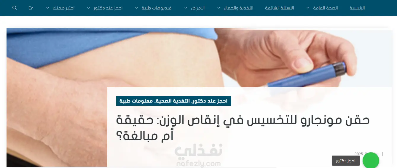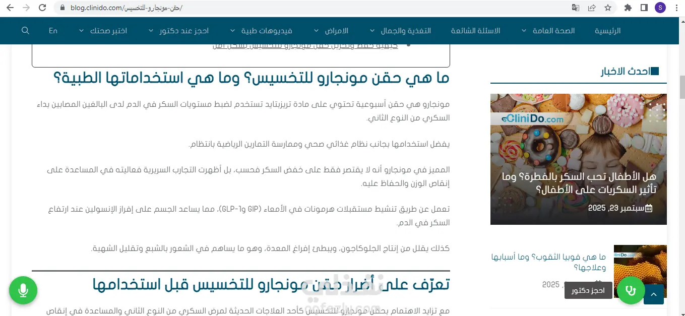 مقال تم نشره على مدونة كلينيدو تناولت فيه كل ما يتعلق بحقن المونجارو من فوائد وأضرار .اعتمدت على المصادر الطبية الموثوقة للحصول على المعلومات الدقيقة. المقال متوافق مع قواعد السيو.