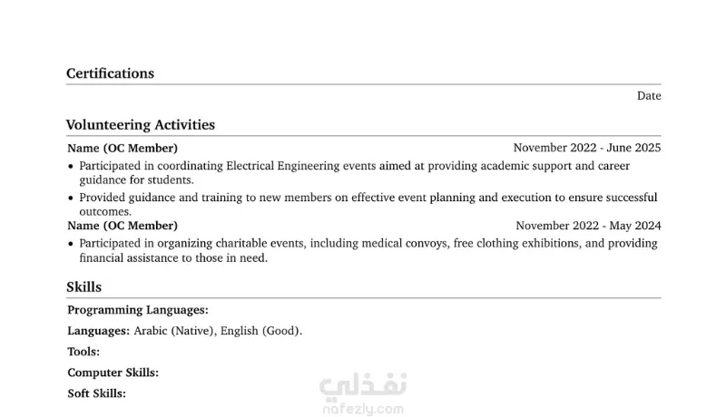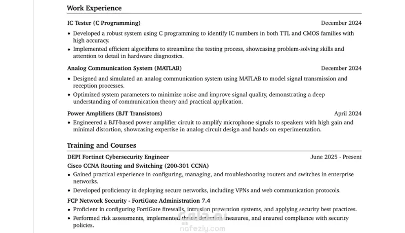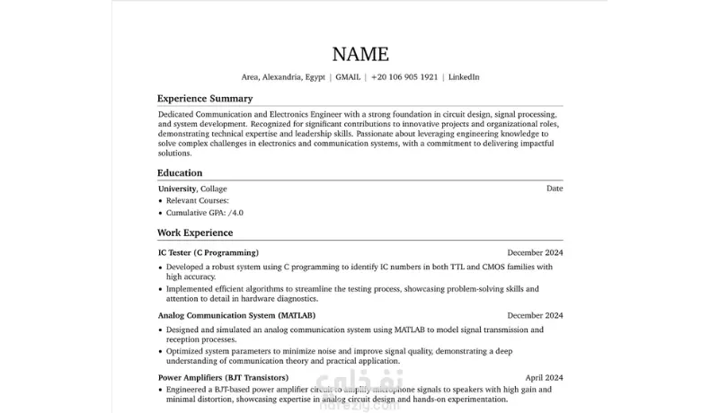 أنا مهندس اتصالات وإلكترونيات وعندي خبرة في كتابة وتصميم السير الذاتية (CV) بشكل احترافي. بعرف أرتب المعلومات وأبرز نقاط القوة والمهارات بطريقة منظمة تخلي سيرتك الذاتية تبان بشكل مميز.
