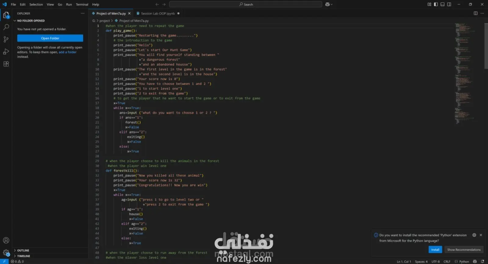 مشروع Hunt Game هو لعبة مغامرات نصيّة بلغة Python، تم تصميمها لتقديم تجربة مشوّقة تجمع بين الترفيه واتخاذ القرارات الذكية. تبدأ القصة حين يجد اللاعب نفسه في موقف غامض بين غابة خطرة وبيت مهجور مليء بالمخلوقات الغريبة.و عليه الاختيار الغابة ام البيت المهجور و المواجهة او الهروب .