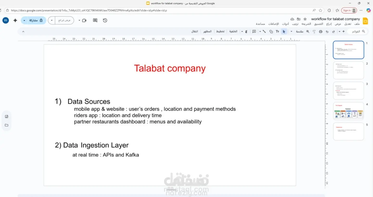 الهدف من العرض تقديم شرح بسيط عن هيكيلة البيانات لشركة Talabat لمساعده الناس معرفة المزيد من المعلومات عن الشركة و عن هيكيلة البيانات .