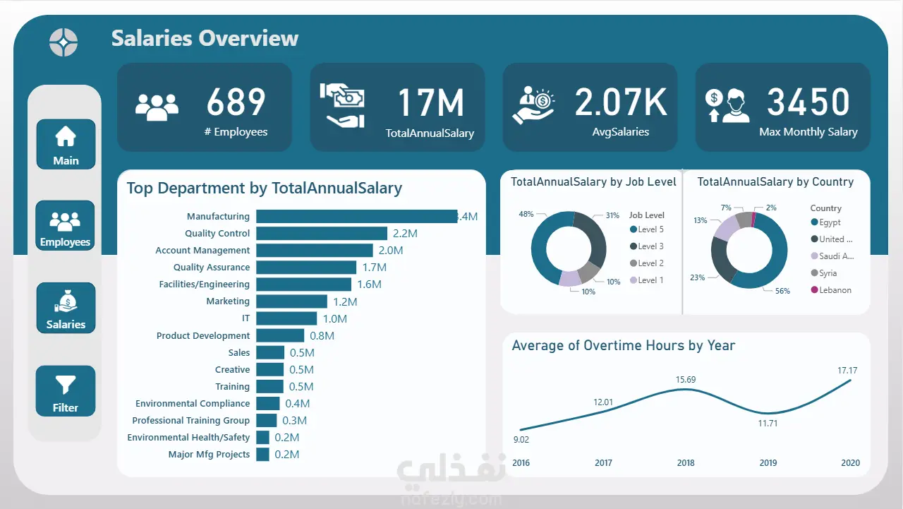قمت بتحليل بيانات الموظفين والمرتبات كما هو موضح في أول صفحه داشبورد بتحتوي علي عدد الموظفين وتقسيمهم حسب الجنس ومتوسط سنين الخبرة ومشاهدة عدد الموظفين في كل قسم في الشركه وفي كل دولة ومعرفة كم عدد الموظفين في كل سنة والصفحه الثانية بتحتوي علي تحليل المرتبات بالنسبة لكل قسم وحسب سنين الخبرة وإجمالي المرتبات لكل دولة قمت بإضافة فلاتر تصفية لفلترة البيانات حسب القسم والسنةوالدولة حتي تكون الداشبورد ديناميكية إذا كنت تبحث عن لوحة معلومات تفاعلية تساعدك على فهم بيانات الموظفين في شركتك ومتابعتها باستمرار، فأنا هنا لمساعدتك في بناء تقارير ولوحات تفاعلية تلبي احتياجاتك