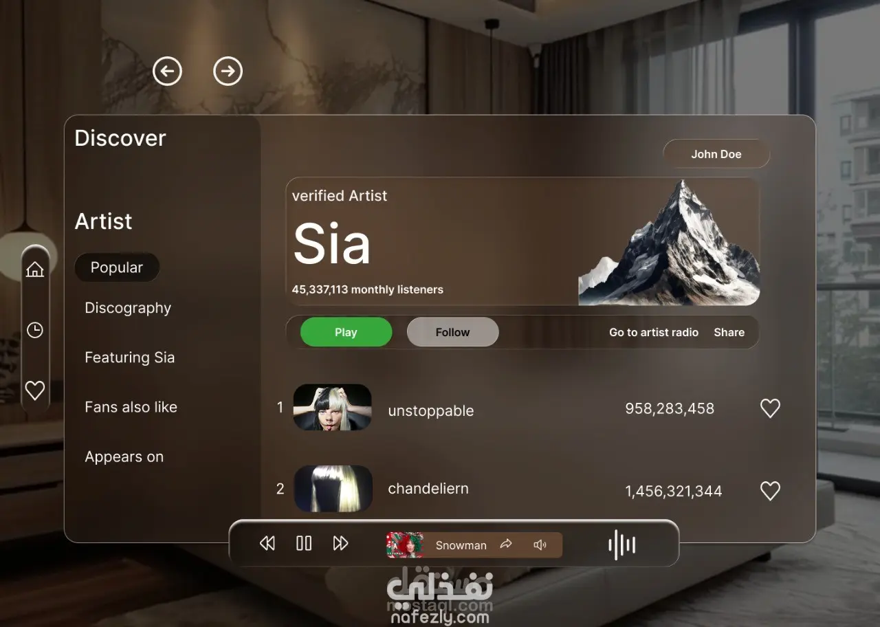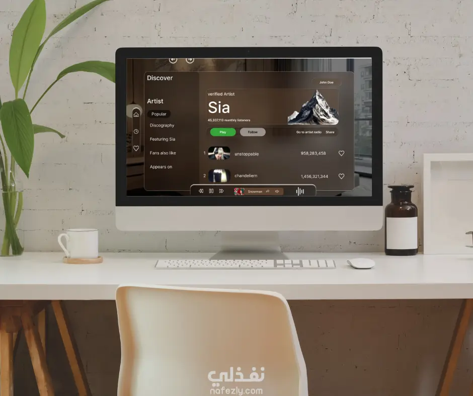 تصميم واجهة مستخدم لمنصة موسيقية داخل بيئة عمل رقمية، تجمع بين البساطة، التنظيم، والراحة البصرية. الهدف هو خلق تجربة تفاعلية سلسة للمستخدم داخل مساحة شخصية تجمع بين العمل والترفيه. العناصر الأساسية: - واجهة موسيقية تعرض أغنية للفنانة "Sia" مع أقسام مثل: Discover، Artist، Albums، Songs. - خلفية بيضاء من الطوب تضيف طابعًا عصريًا ونظيفًا. - توزيع العناصر على المكتب (نبتة، زجاجة، شاشة) يعكس توازن بصري واهتمام بالتفاصيل. - لقطة شاشة إضافية توضح واجهة برمجية أو تصميمية، مما يشير إلى تعدد المهام أو بيئة عمل