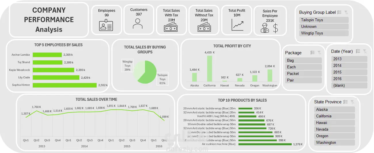 • تصميم لوحة تفاعلية توضح الأداء العام من حيث المبيعات، الأرباح، والمنتجات حسب المناطق.