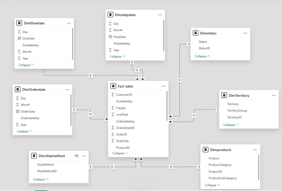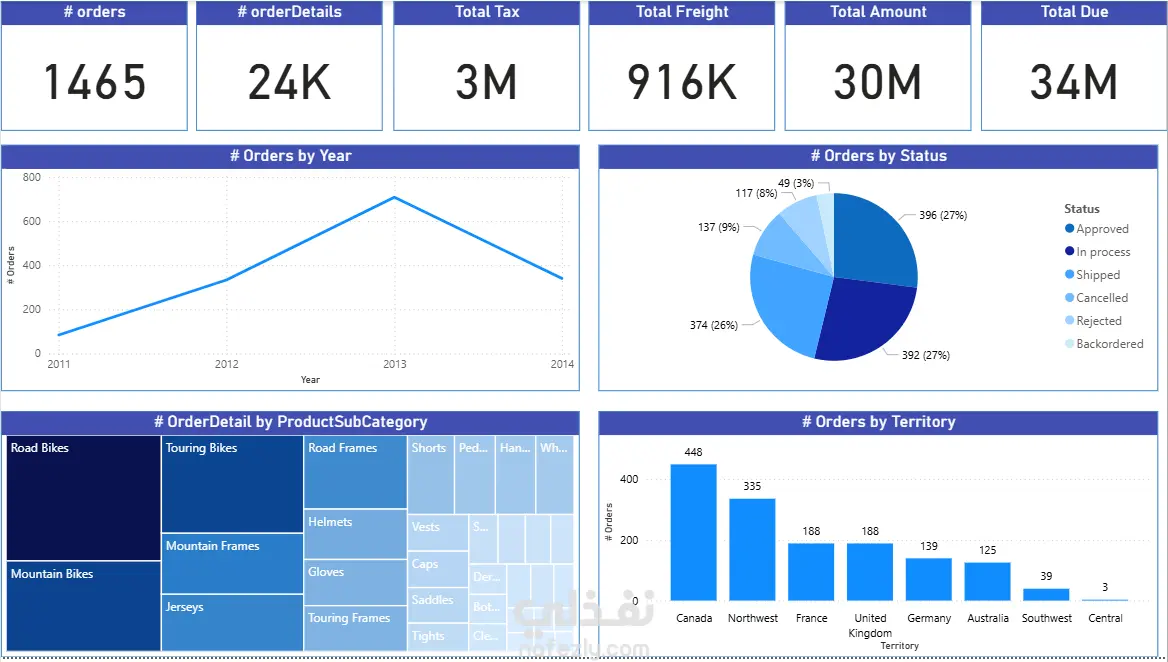 تم تطوير لوحة تحكم تفاعلية لتحليل أداء المبيعات، لمساعدة العميل على تتبع مؤشرات الأداء الرئيسية (KPIs) مثل عدد الطلبات، إجمالي المبيعات، الضرائب، ومعدلات الشحن، بالإضافة إلى تحليل الأداء حسب المناطق وحالات الطلبات. خطوات تنفيذ المشروع: - تنظيف البيانات وتصحيح الأخطاء باستخدام Power Query (حذف القيم المكررة والمفقودة، وتوحيد أنواع البيانات). - تصميم نموذج البيانات (Data Modeling): بناء نموذج Star Schema يربط بين جدول الحقائق (Fact Table) الخاص بالطلبات وجداول الأبعاد (العملاء – المناطق – المنتجات – الوقت) و إنشاء العلاقات بين الجداول لتسهيل التحليل التفاعلي عبر التقارير المختلفة. - إنشاء المقاييس (DAX Measures): لحساب مؤشرات الأداء الرئيسية مثل: ( إجمالي عدد الطلبات، إجمالي المبيعات، إجمالي الضرائب والشحن، الطلبات حسب الحالة أو الإقليم، مقارنة الأداء السنوي) - إنشاء لوحة تفاعلية في Power BI تجمع بين المؤشرات والرسوم البيانية بطريقة منظمة وسهلة القراءة. - إضافة Tooltips لعرض التفاصيل عند تمرير المؤشر على العناصر. - تحليل النتائج واستخلاص الرؤى مما ساعد علي اتخاذ قرارات مبنية على بيانات دقيقة.