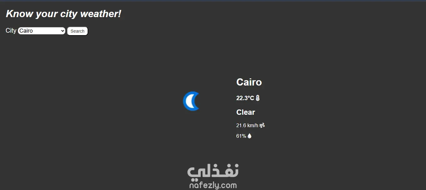 تطبيق يقوم بعرض الطقس بناء علي اختيار المستخدم للمدينة في دولة مصر يعتمد علي فكرة ارسال طلبات لAPI خاص بموقع ما وعرض البيانات في الموقع كما يتميز بالتجاوب مع مختلف احجام الشاشات طُورَ باستخدام كل من: 1- HTML and CSS 2- Python with Django Framework