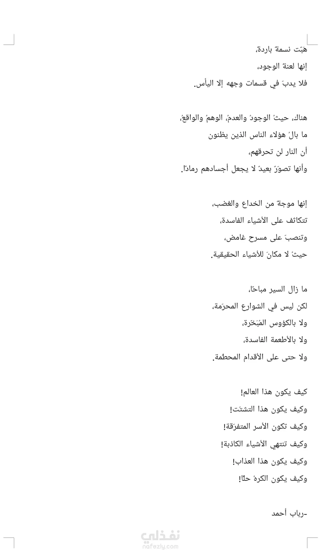 نص أدبي تأملي من كتابتي، يتناول الصراع بين الوجود والعدم. يظهر النص أسلوبي في الكتابة النثرية المعتمدة على الرمز والتأمل النفسي.