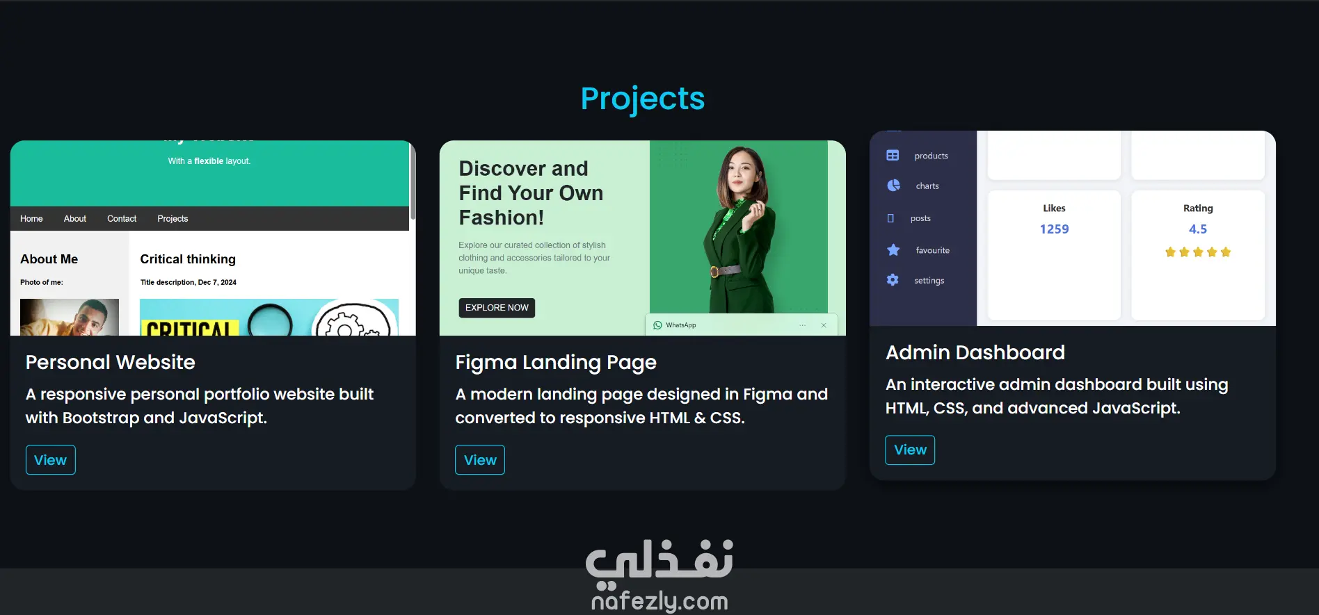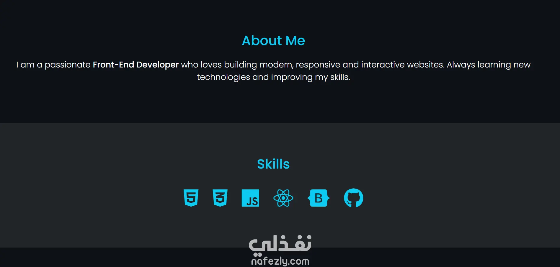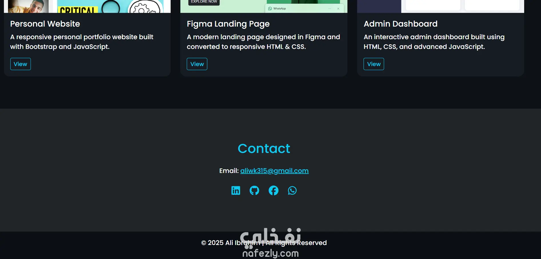 قمت بتصميم وتطوير موقع شخصي متكامل باستخدام HTML, CSS, Bootstrap, JavaScript. الموقع متجاوب مع جميع الأجهزة ويحتوي على أقسام أساسية (Home – About – Skills – Projects – Contact). يتميز بسرعة التحميل والتصميم العصري.