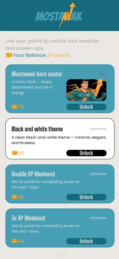 تطبيق Mostawak هو تطبيق تعليمي تفاعلي مبني بتقنية Flutter، يهدف إلى جعل التعلم ممتع ومليء بالتحديات. يتيح للمستخدمين تعلم مهارات جديدة، ومنافسة أصدقائهم في بيئة تعليمية محفزة، مع تصميم عصري ودعم للغتين العربية والإنجليزية.
