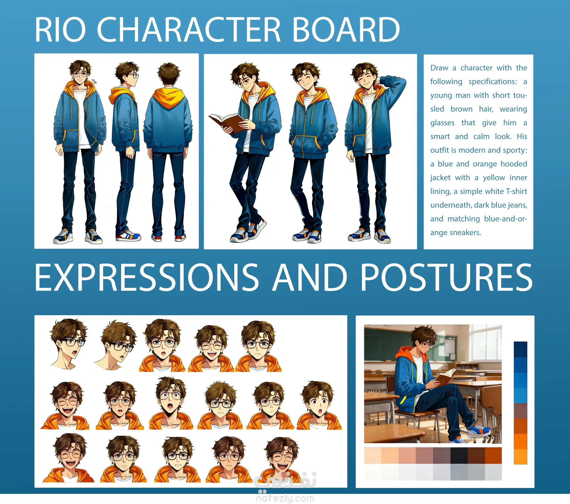 جهزت لوح كامل للشخصية فيه صور من الأمام والجانب والخلف، مع حركات مختلفة زي الوقوف، القراءة، والتفاعل الطبيعي.