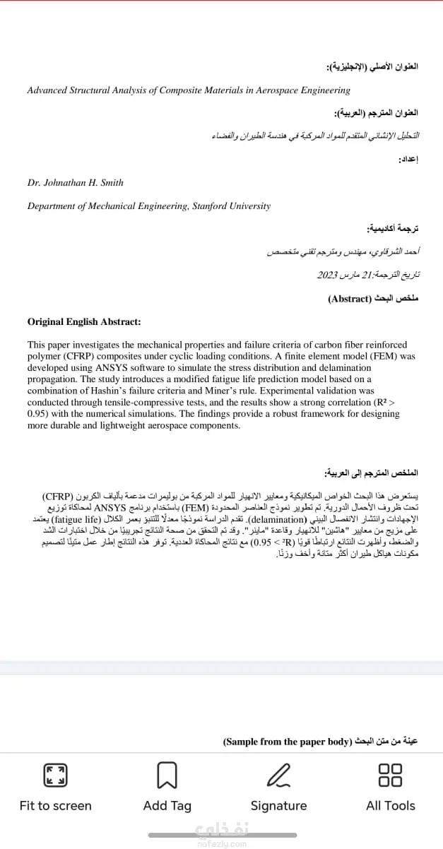 المصطلحات التقنية الدقيقة: ترجمة مصطلحات متخصصة مثل "الانفصال البيني (Delamination)"، و"الخواص المتعامدة (Orthotropic Properties)"، و"نمذجة العناصر المحدودة (Finite Element Modeling)" بدقة تامة.