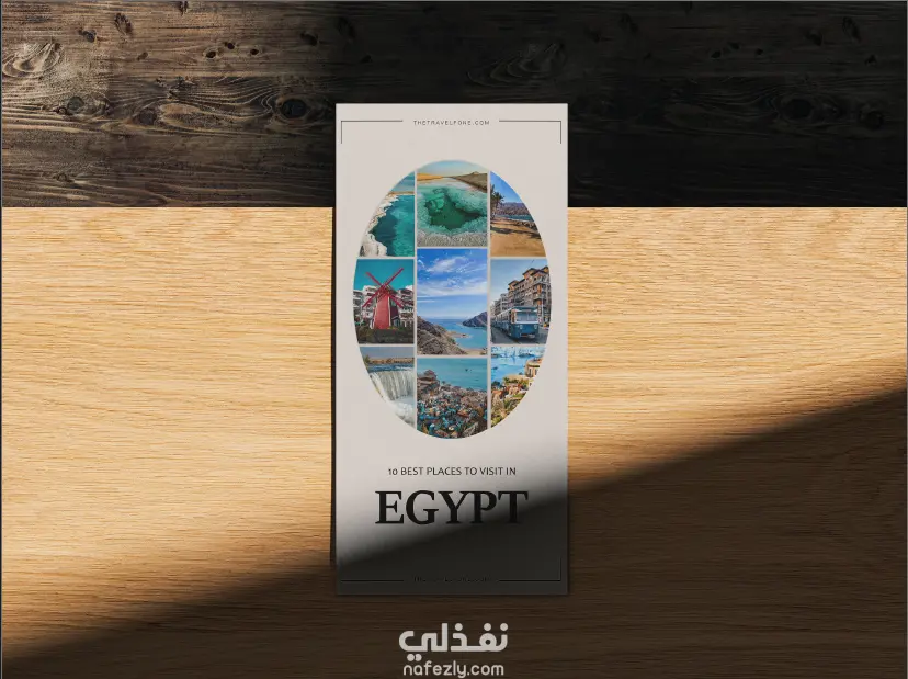 يُظهر هذا الفلاير تصميمًا إبداعيًا بموضوع السياحة والسفر يروّج لأجمل 10 وجهات سياحية في مصر. يتميّز التصميم بوجود كولاج بيضاوي الشكل في المنتصف يضم مجموعة من الصور عالية الجودة التي تُبرز تنوّع المعالم المصرية بين الشواطئ الخلابة، المنتجعات الساحلية، المناظر الطبيعية، والمعالم التاريخية. تعتمد لوحة الألوان على درجات الأزرق الفيروزي والدرجات الرملية الدافئة، مما يعكس جمال البحر الأحمر وسحر الصحراء المصرية. يظهر العنوان "10 Best Places to Visit in Egypt" أسفل التصميم بخط عصري وواضح، مع إبراز كلمة EGYPT لجذب الانتباه وإبراز هوية الفلاير السياحية. التصميم بشكل عام يتميّز بالأناقة والبساطة والتوازن البصري، مما يجعله مناسبًا للاستخدام في حملات الترويج السياحي، أو كمنشور دعائي، أو ضمن مواد التسويق الرقمية. كما أن الخلفية الخشبية تضيف لمسة طبيعية دافئة تعزز جاذبية العرض.