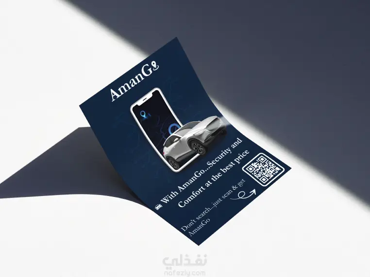 يُروّج هذا الفلاير لتطبيق AmanGo، وهو تطبيق مخصص لخدمات النقل والتوصيل يهدف إلى تقديم الأمان والراحة وسهولة الاستخدام بأفضل الأسعار للمستخدمين. يتميّز التصميم بخلفية زرقاء داكنة ترمز إلى الثقة والاحترافية والتكنولوجيا، وفي المنتصف تظهر صورة ثلاثية الأبعاد لهاتف ذكي تخرج منه سيارة تعبّر عن فكرة التطبيق الذي يربط المستخدمين بخدمة النقل بسرعة وسهولة عبر الهاتف. اُستخدمت خطوط عصرية وتنسيق متوازن لخلق مظهر أنيق وواضح، مع ألوان فضية وبيضاء تمنح التصميم لمسة عصرية جذّابة. كما تمت إضافة رمز QR في الأسفل ليتيح للمستخدمين تحميل التطبيق مباشرة، مما يعزز مفهوم السهولة والسرعة في الوصول للخدمة. أما الشعار “With AmanGo... Security and Comfort at the Best Price” فيعبّر عن التزام التطبيق بتقديم خدمة آمنة ومريحة وسعر مناسب لجميع المستخدمين.