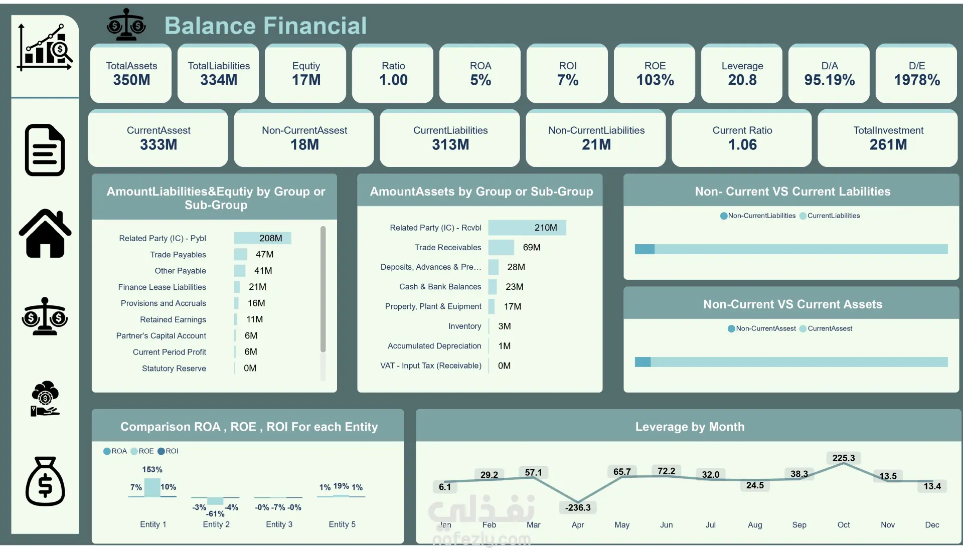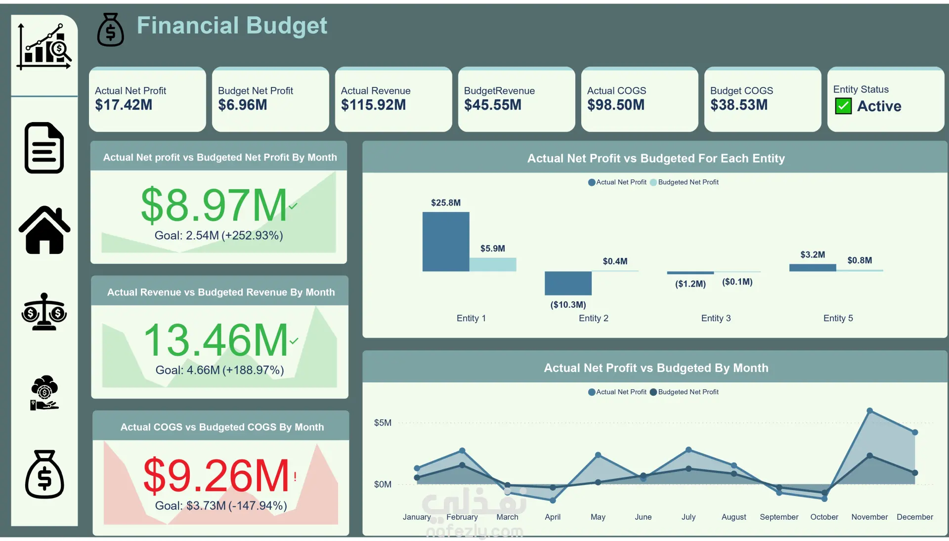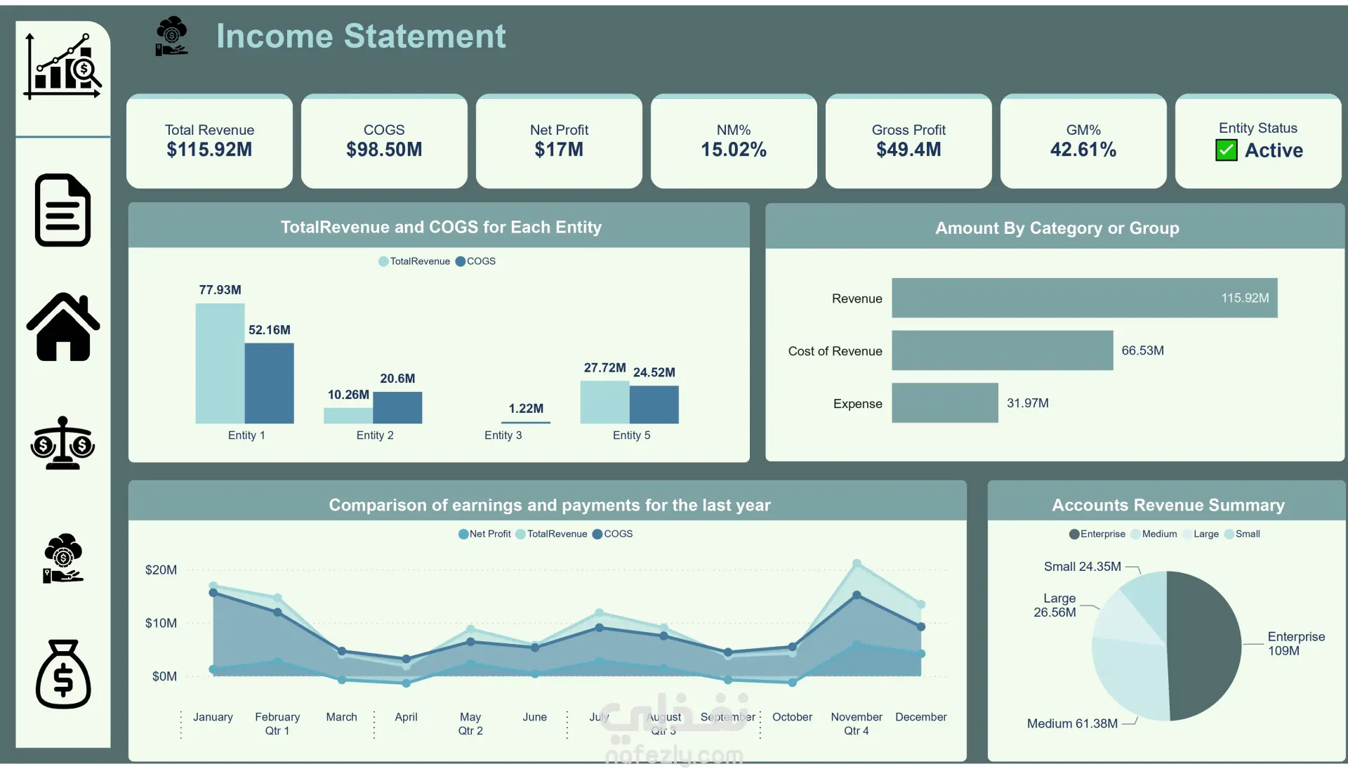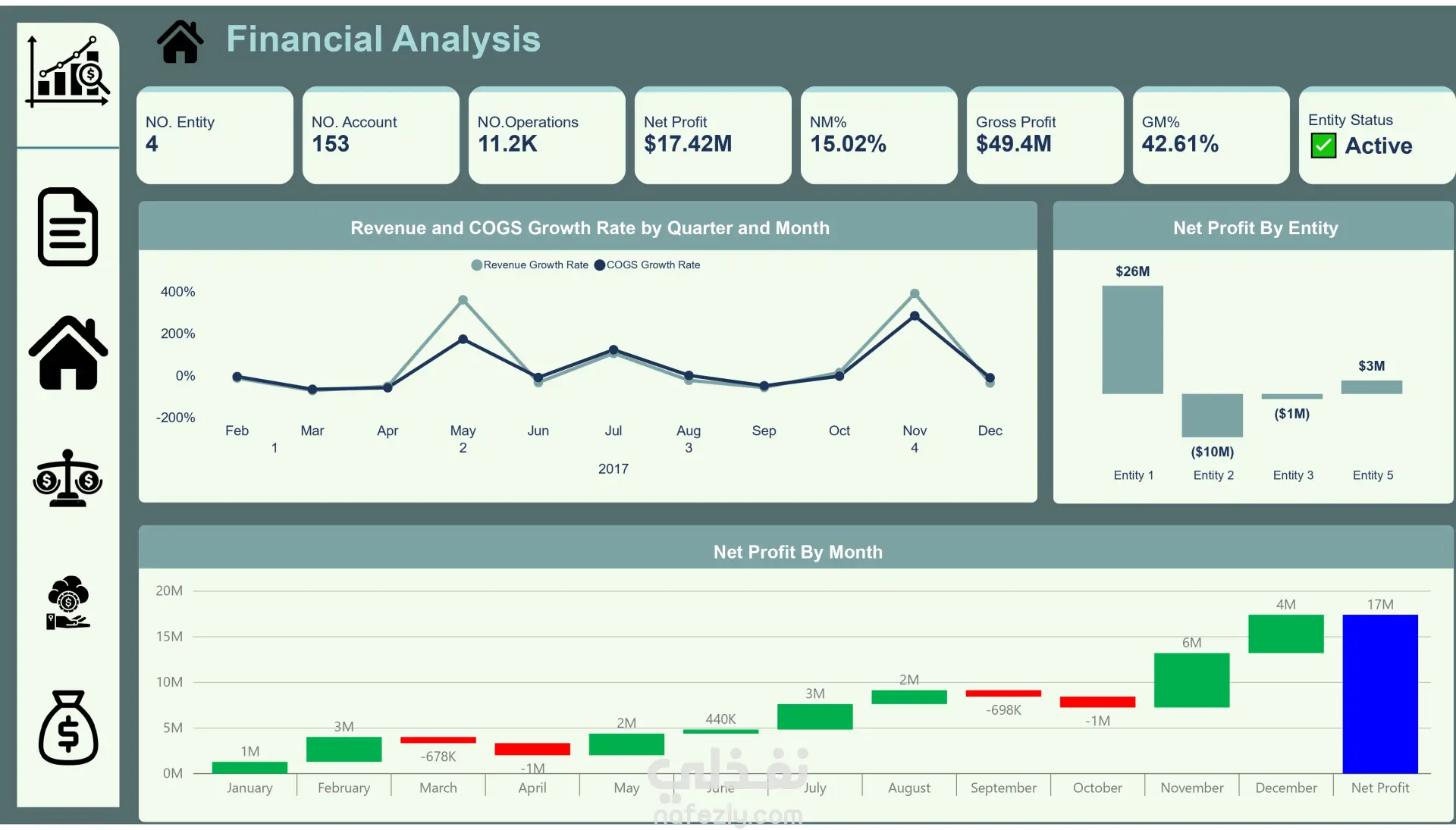 تحليل الأداء المالي لشركة من خلال تتبع الإيرادات، المصاريف، صافي الربح، والربحية لكل كيان أو قطاع داخل الشركة عبر الفترات الزمنية المختلفة