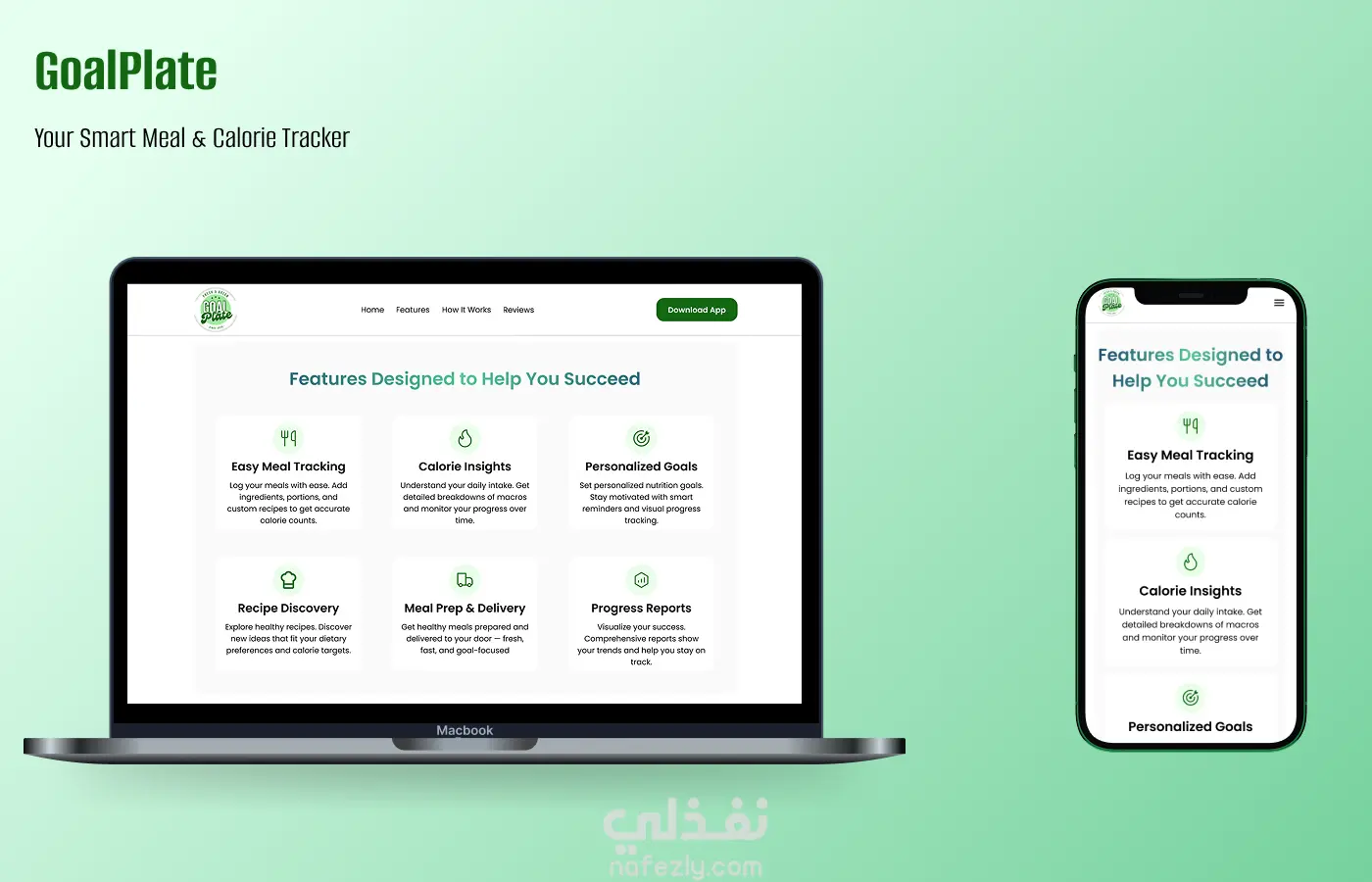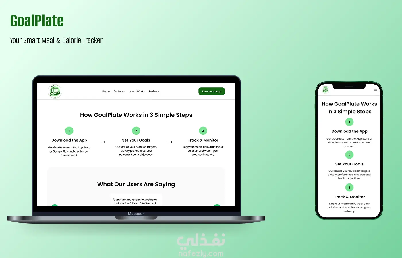 قمت بتصميم صفحة هبوط (Landing Page) لتطبيق GoalPlate بهدف تعريف الزوار بفكرة التطبيق وتشجيعهم على تحميله وتجربته.