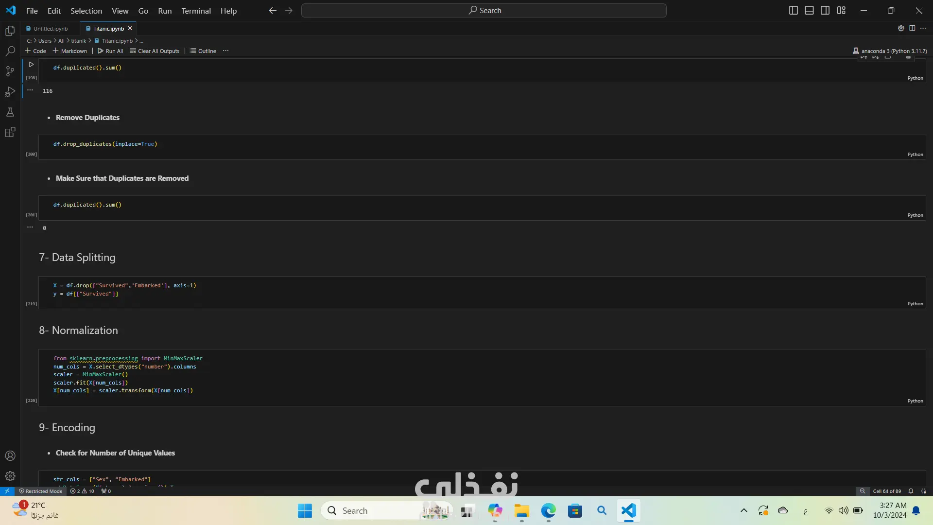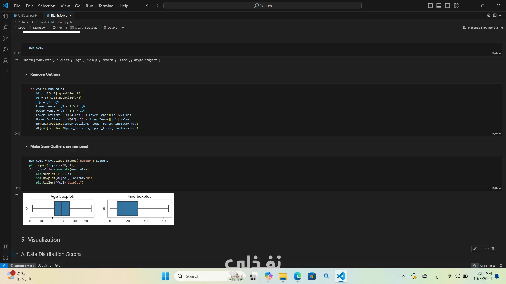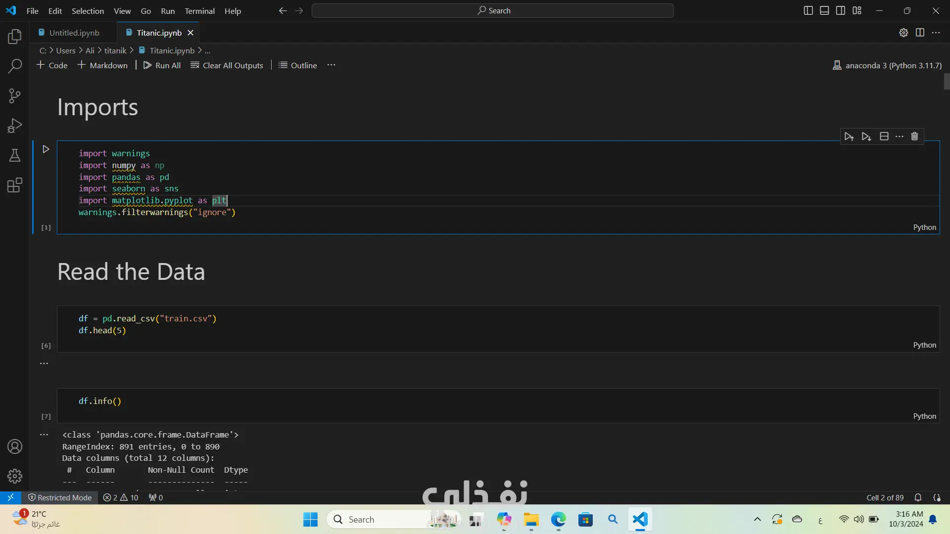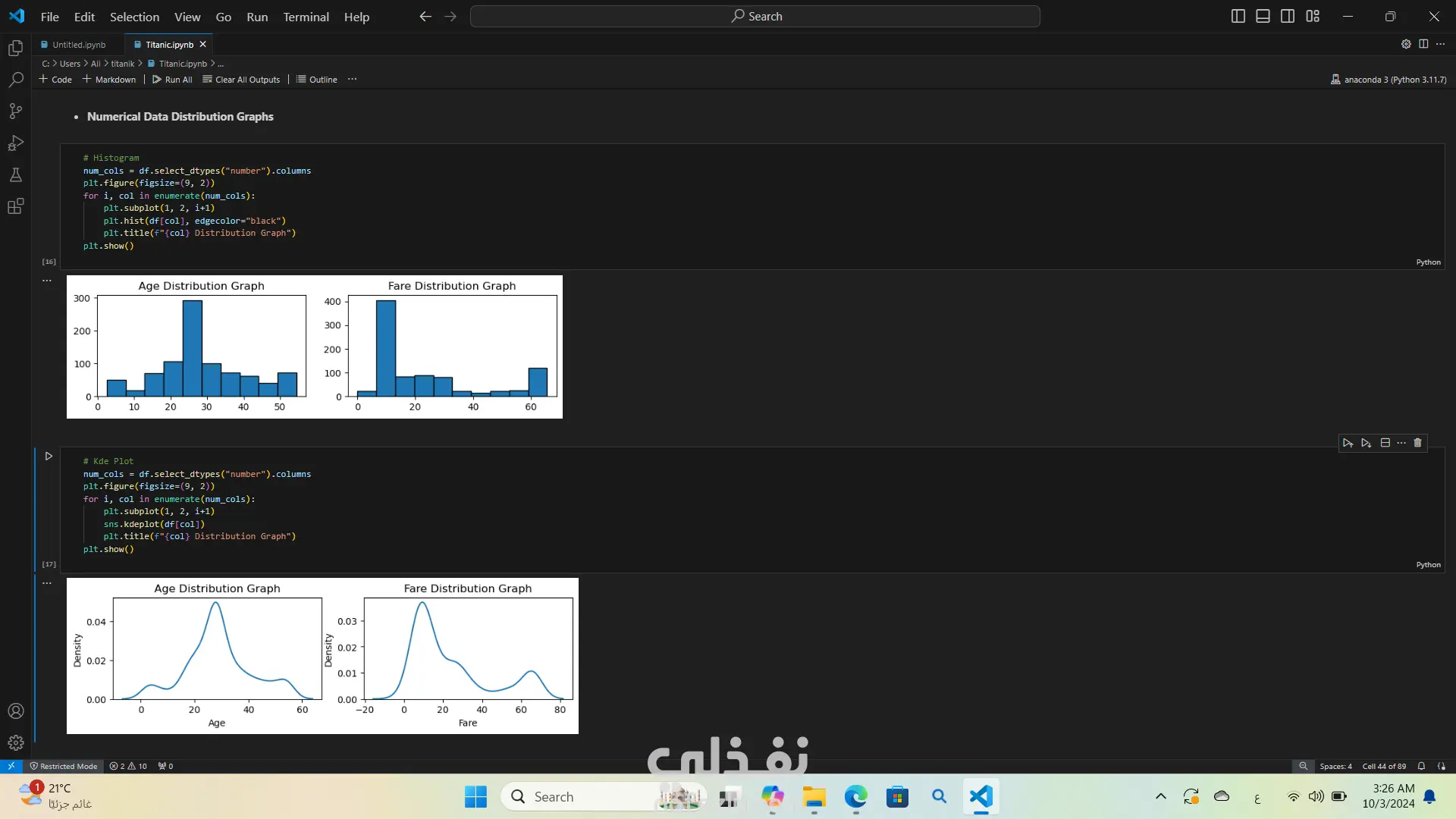 لقد قمت بتحليل بيانات غرق سفينة تيتنك باستخدام لغة البرمجة بايثون استخدمت مكتبات مثل Pandas وNumPy لتحليل البيانات، وMatplotlib وSeaborn لإنشاء الرسوم البيانية والتصورات كان هذا التحليل مفيدًا جدًا في استخراج الأفكار والأنماط من البيانات