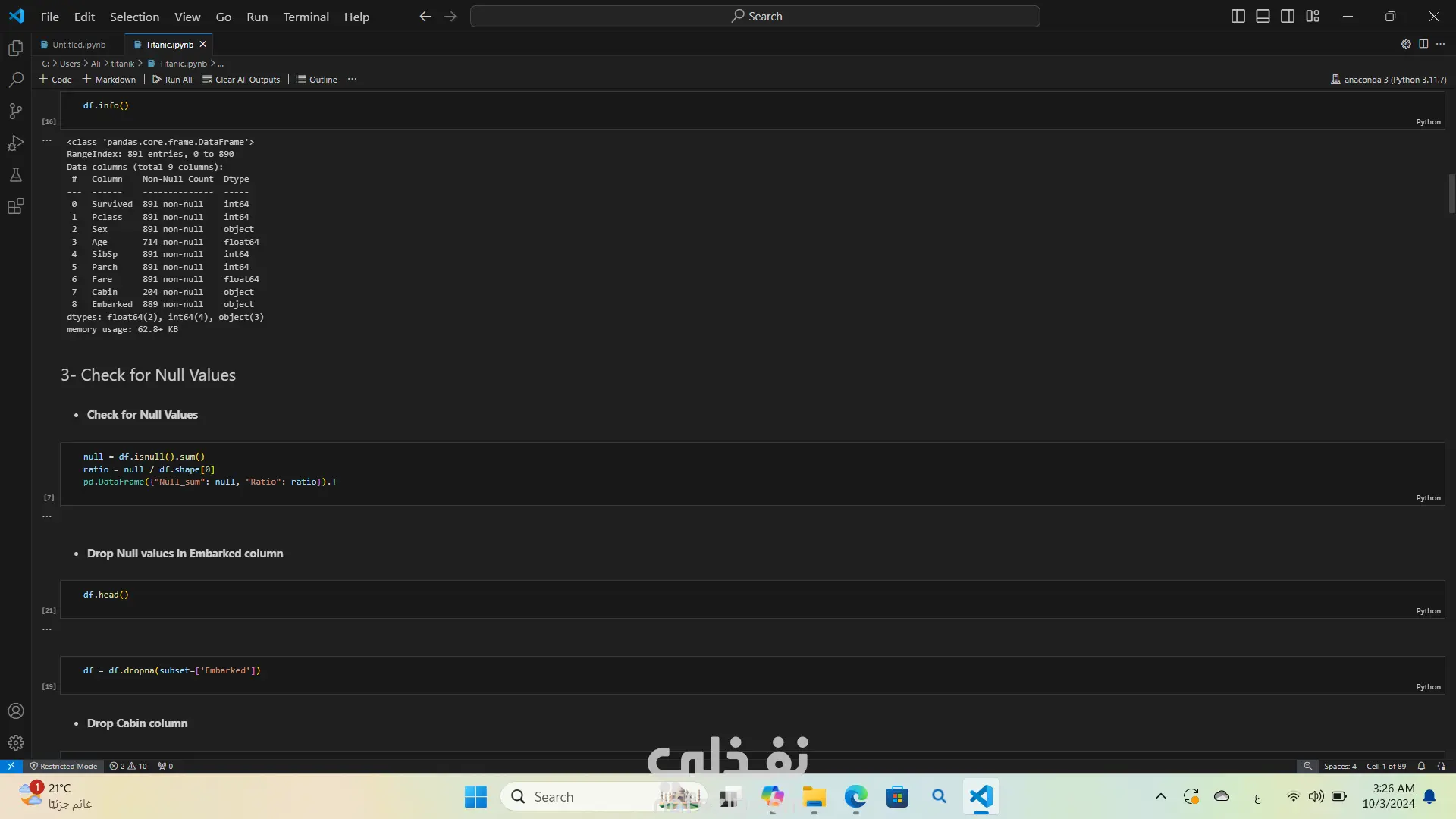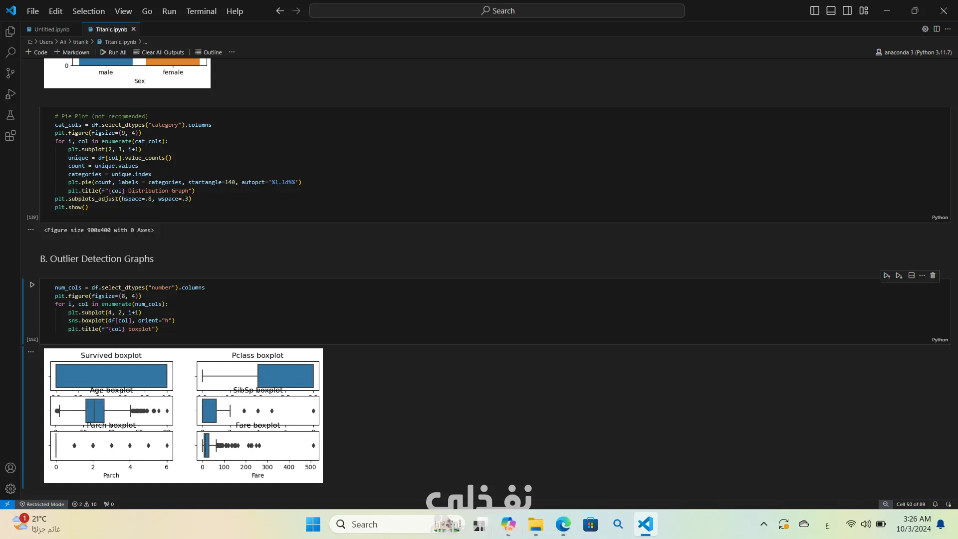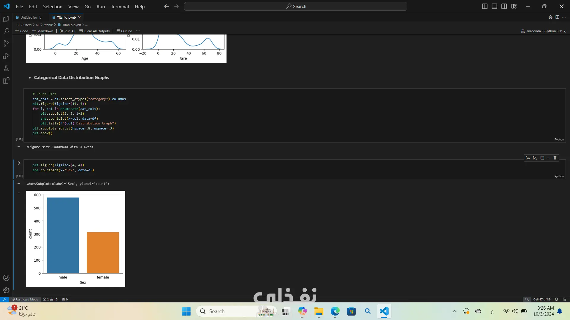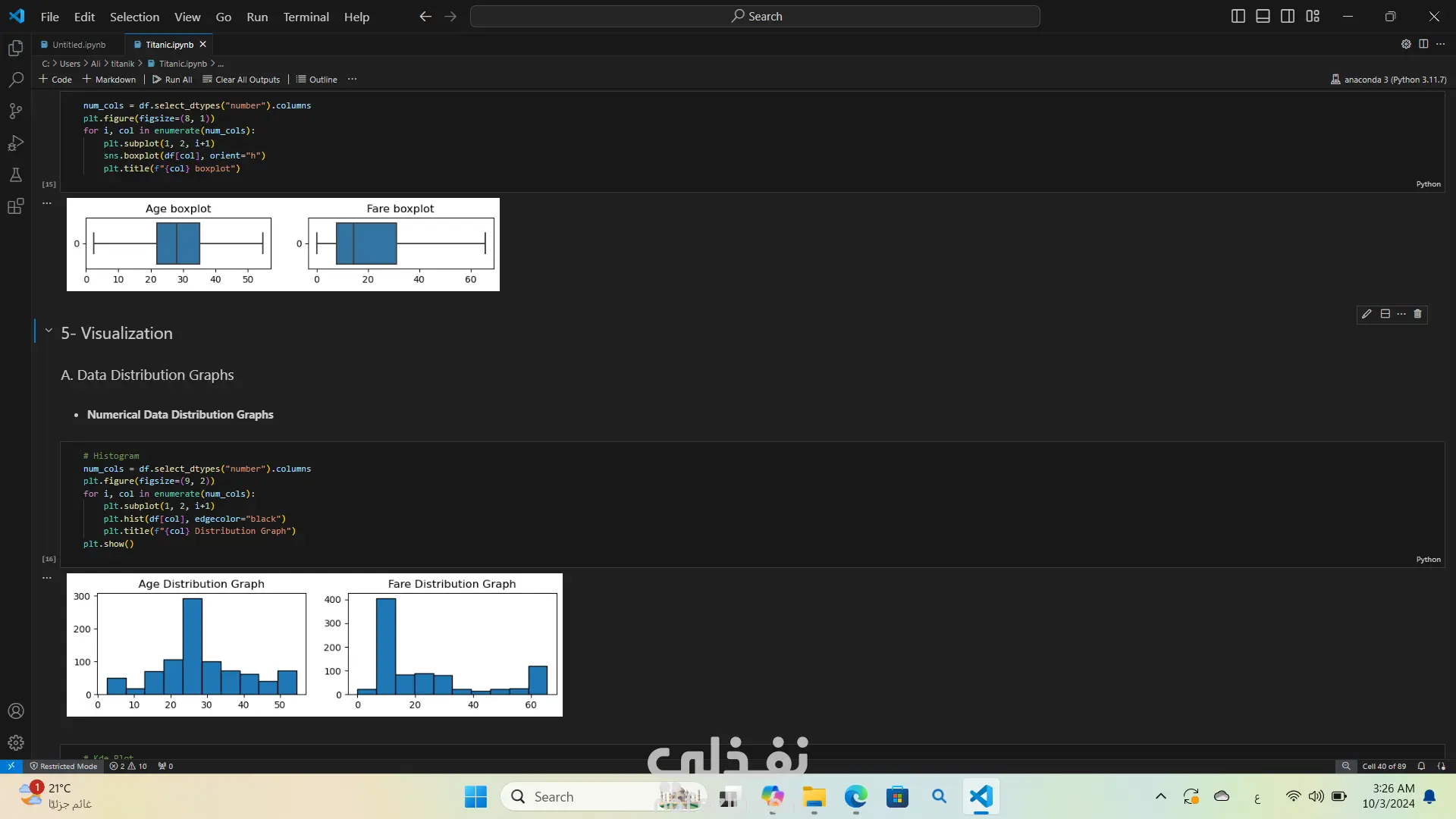 تحليل بيانات غرق السفينه تيتنك باستخدام لغة البرمجة بايثون استخدمت مكتبات مثل Pandas وSeabornوMatplotlibوNumPy