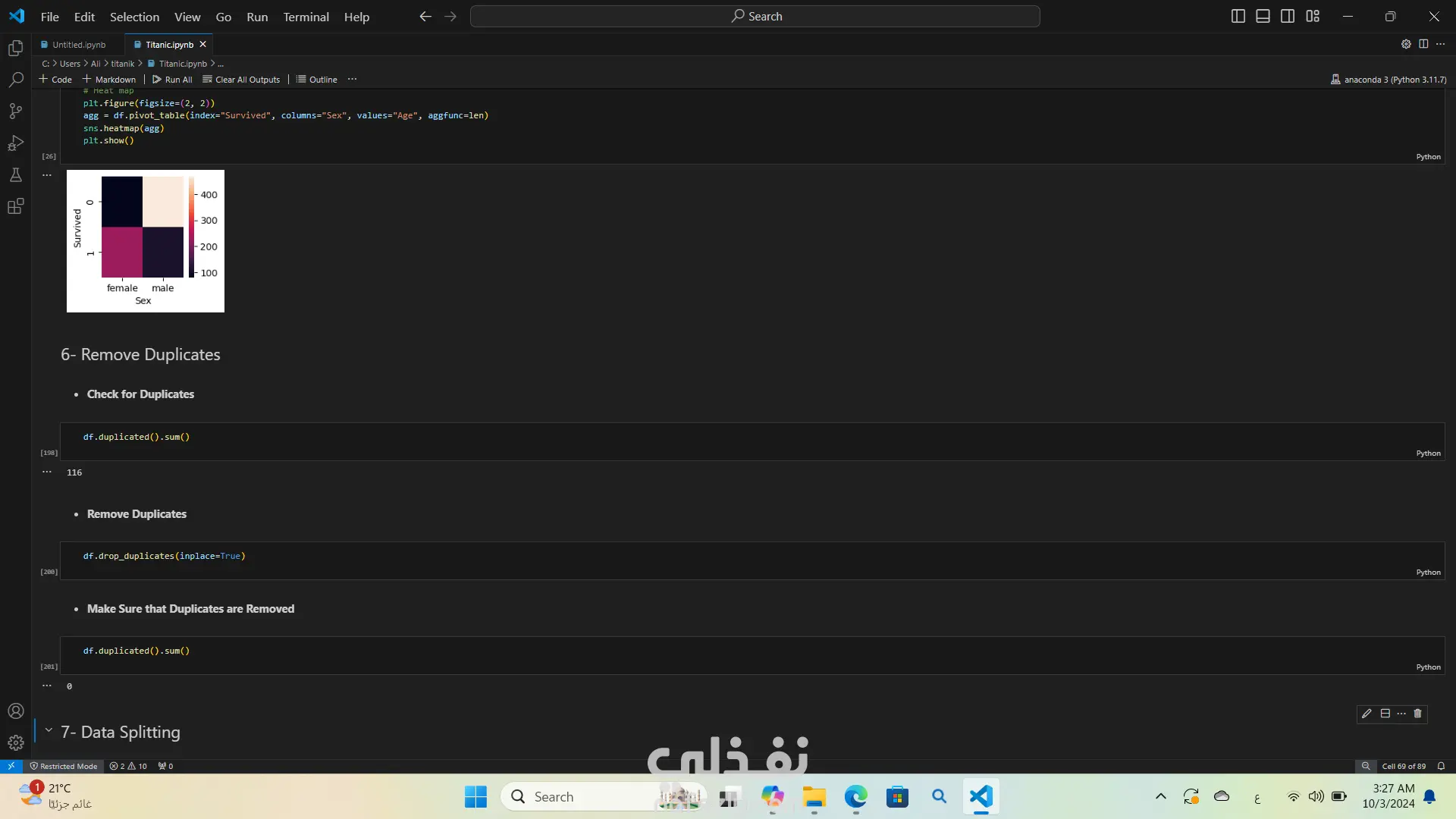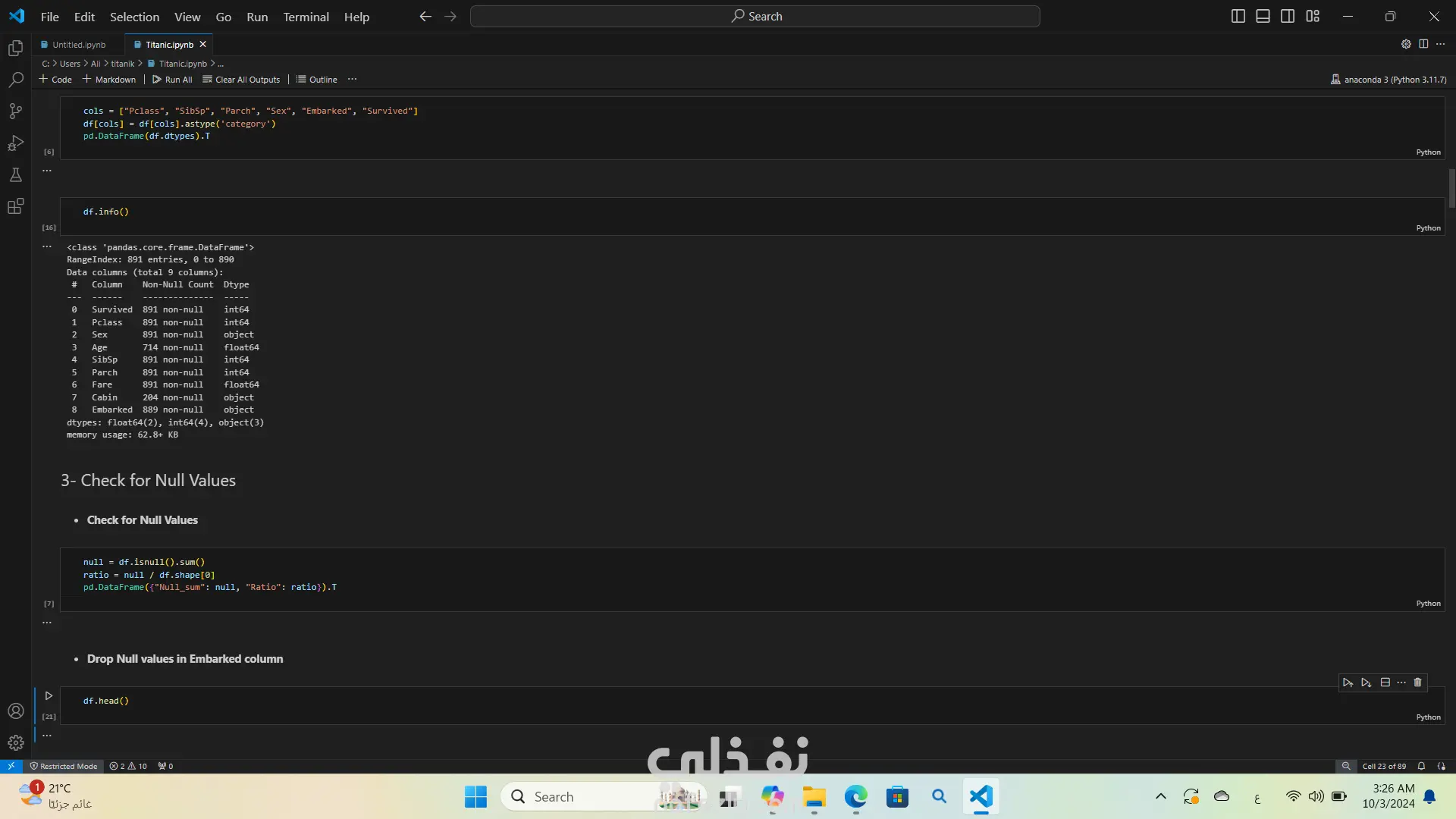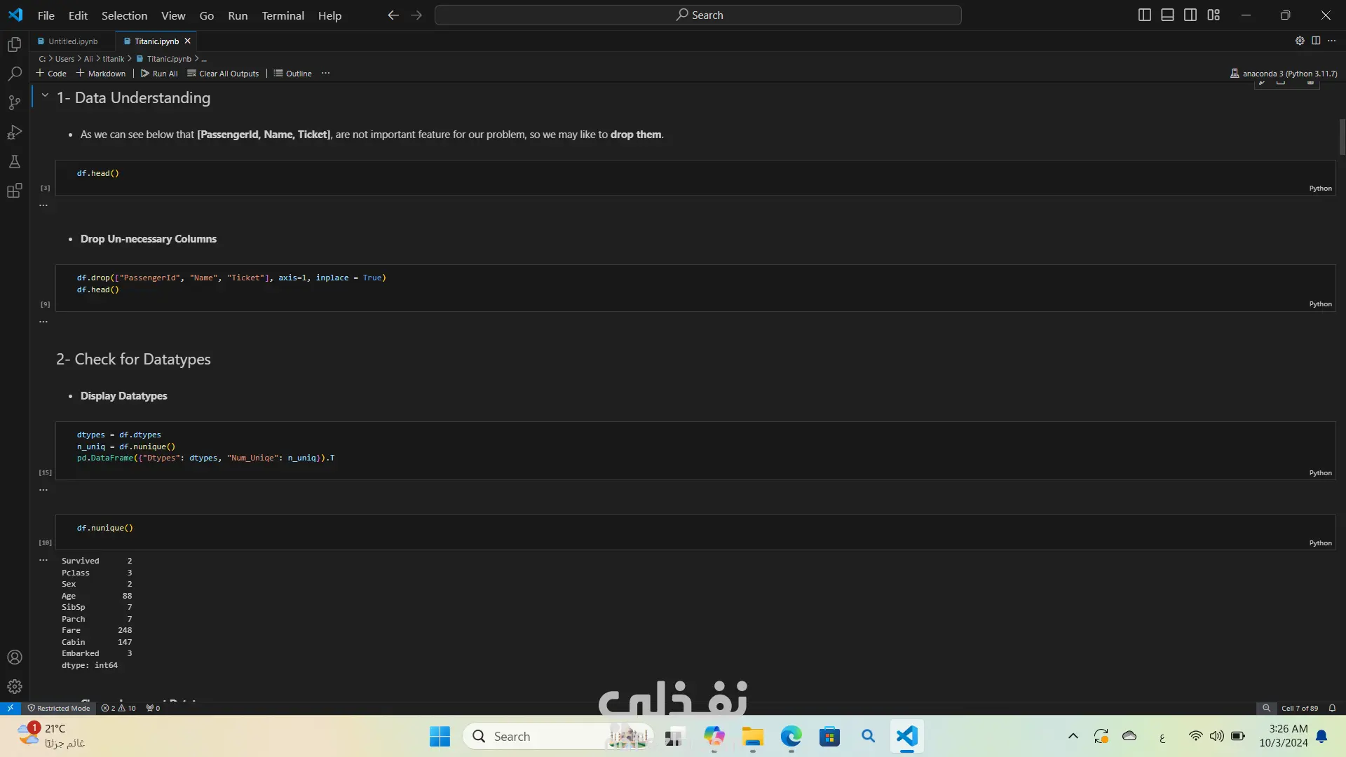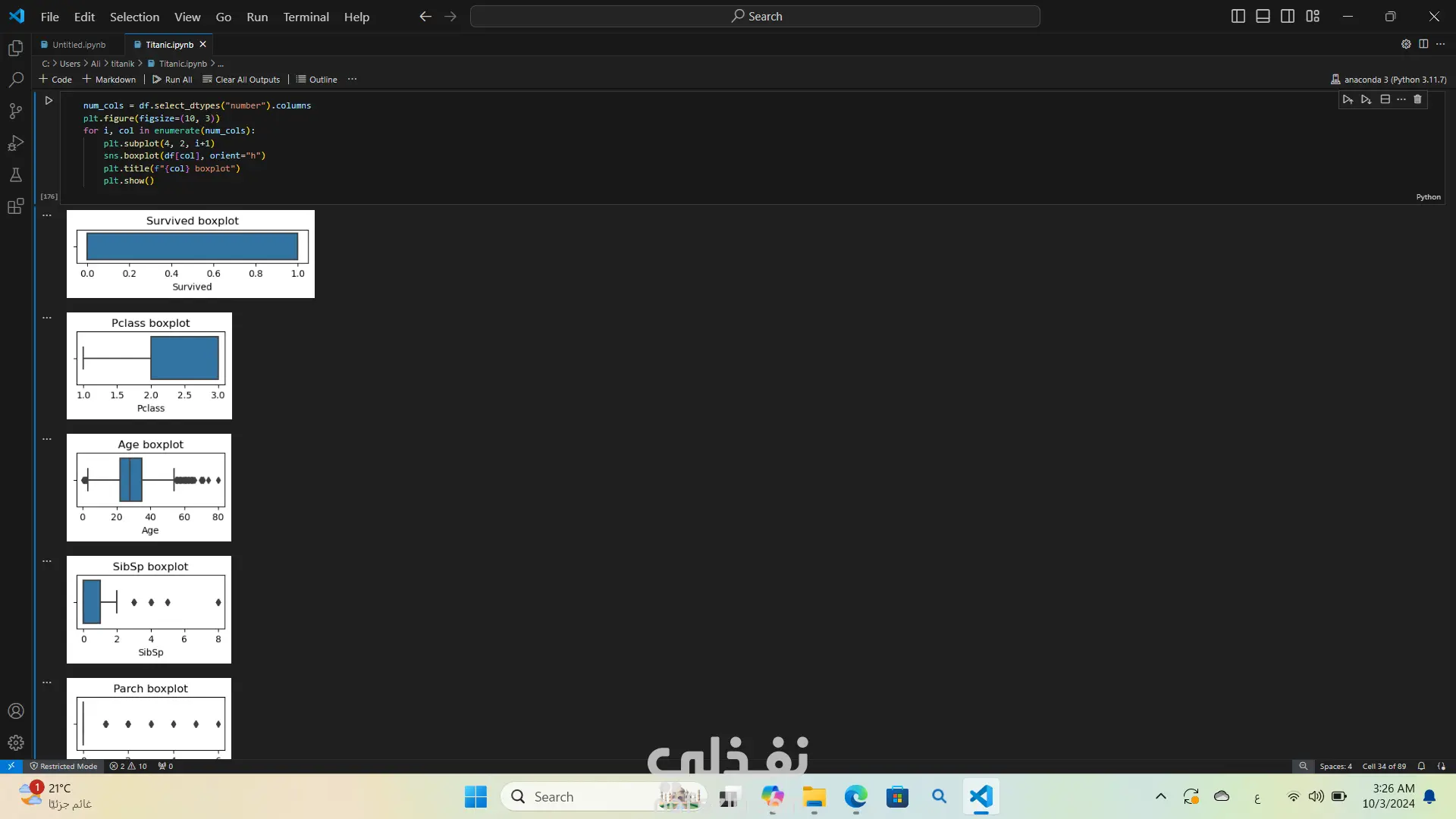 تحليل بيانات غرق السفينه تيتنك باستخدام لغة البرمجة بايثون استخدمت مكتبات مثل Pandas وSeabornوMatplotlibوNumPy