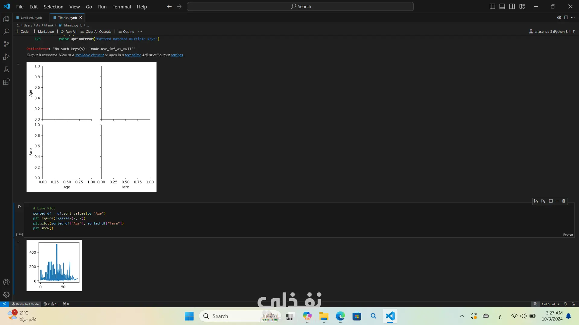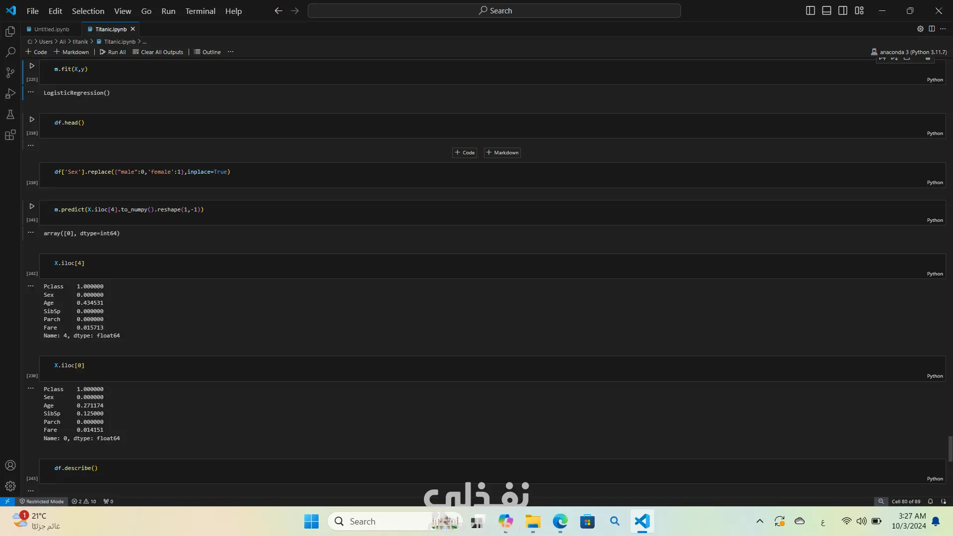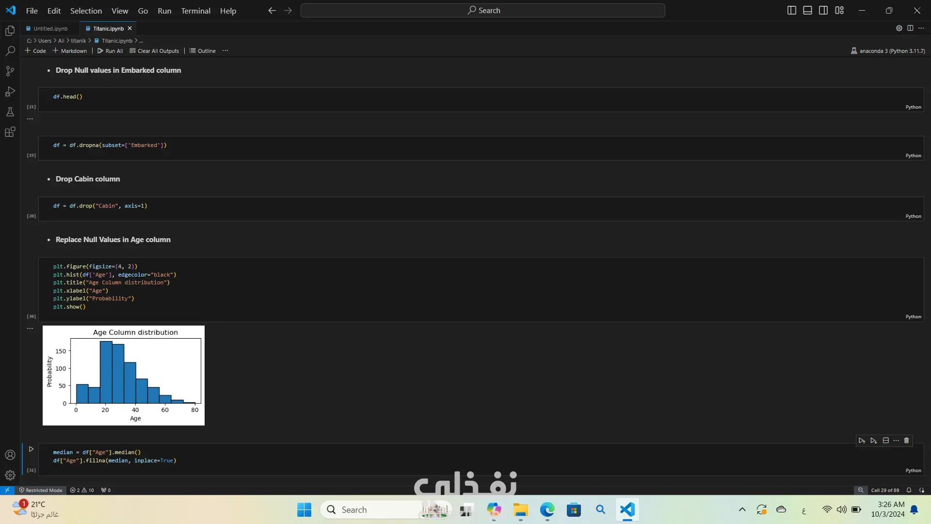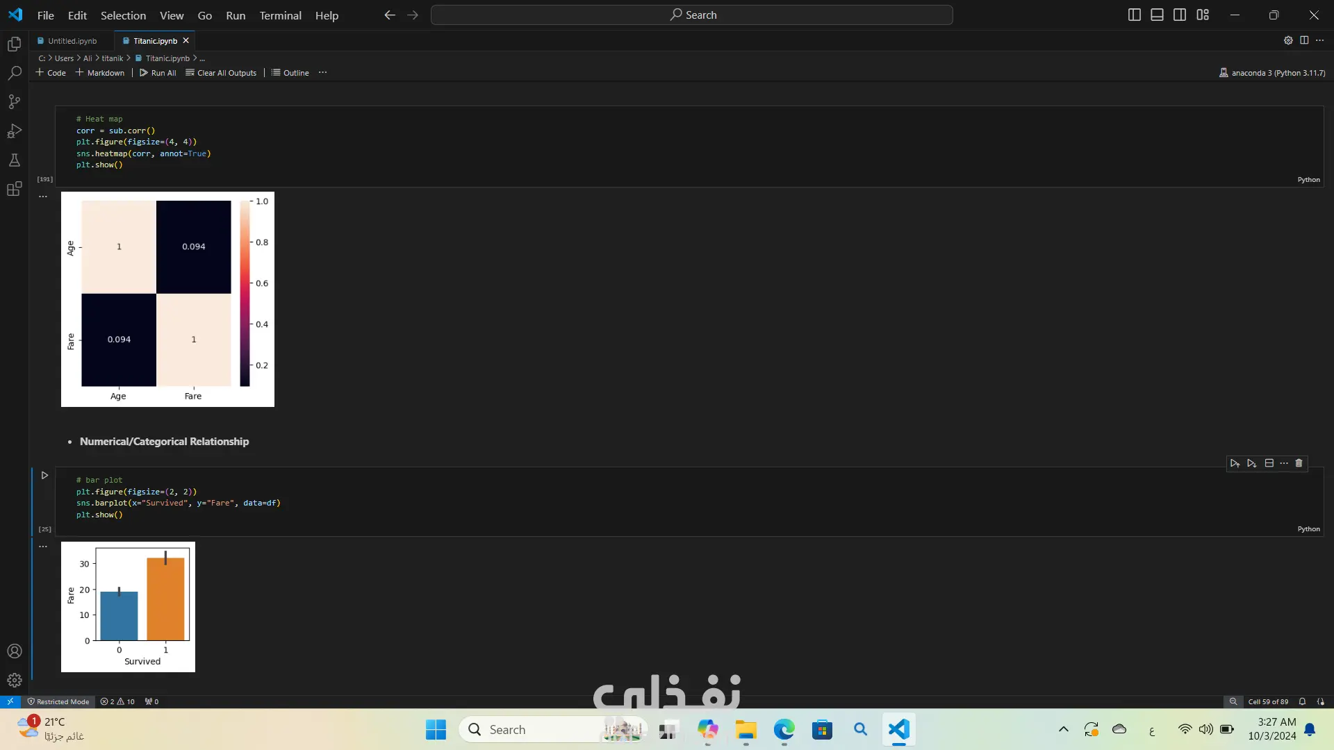 تحليل بيانات غرق السفينه تيتنك باستخدام لغة البرمجة بايثون استخدمت مكتبات مثل Pandas وSeabornوMatplotlibوNumPy