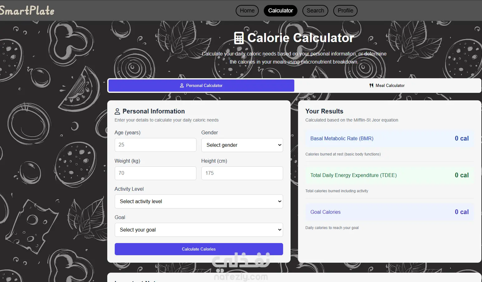 طبيق ويب شامل (Full-Stack) لتتبع التغذية والسعرات الحرارية، تم تطويره لمساعدة المستخدمين على مراقبة نظامهم الغذائي، حساب احتياجاتهم اليومية من السعرات، وتتبع المغذيات الكبرى (الماكروس). يتميز التطبيق بواجهة مستخدم نظيفة ومتجاوبة (Responsive)، نظام تسجيل دخول آمن، ولوحة تحكم تفاعلية لمتابعة التقدم.