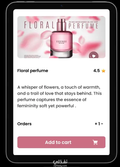 تصميم كارد منتج عطر (Floral Perfume) مخصص لتطبيق تسوّق إلكتروني. يعرض المنتج بطريقة أنيقة وبسيطة مع إبراز الصورة، التقييم، وصف جذّاب، وعدّاد للطلبات، وزر "Add to Cart". تم اختيار ألوان وردية ناعمة لتعكس الطابع الأنثوي والراقي للعطر، مع تنسيق متوازن يجعل التجربة البصرية مريحة وواضحة للمستخدم. الكارد مصممة بأسلوب حديث ومرن (Responsive Design) لتناسب مختلف الشاشات، وتعتمد على واجهة مستخدم جذّابة وسهلة التفاعل.