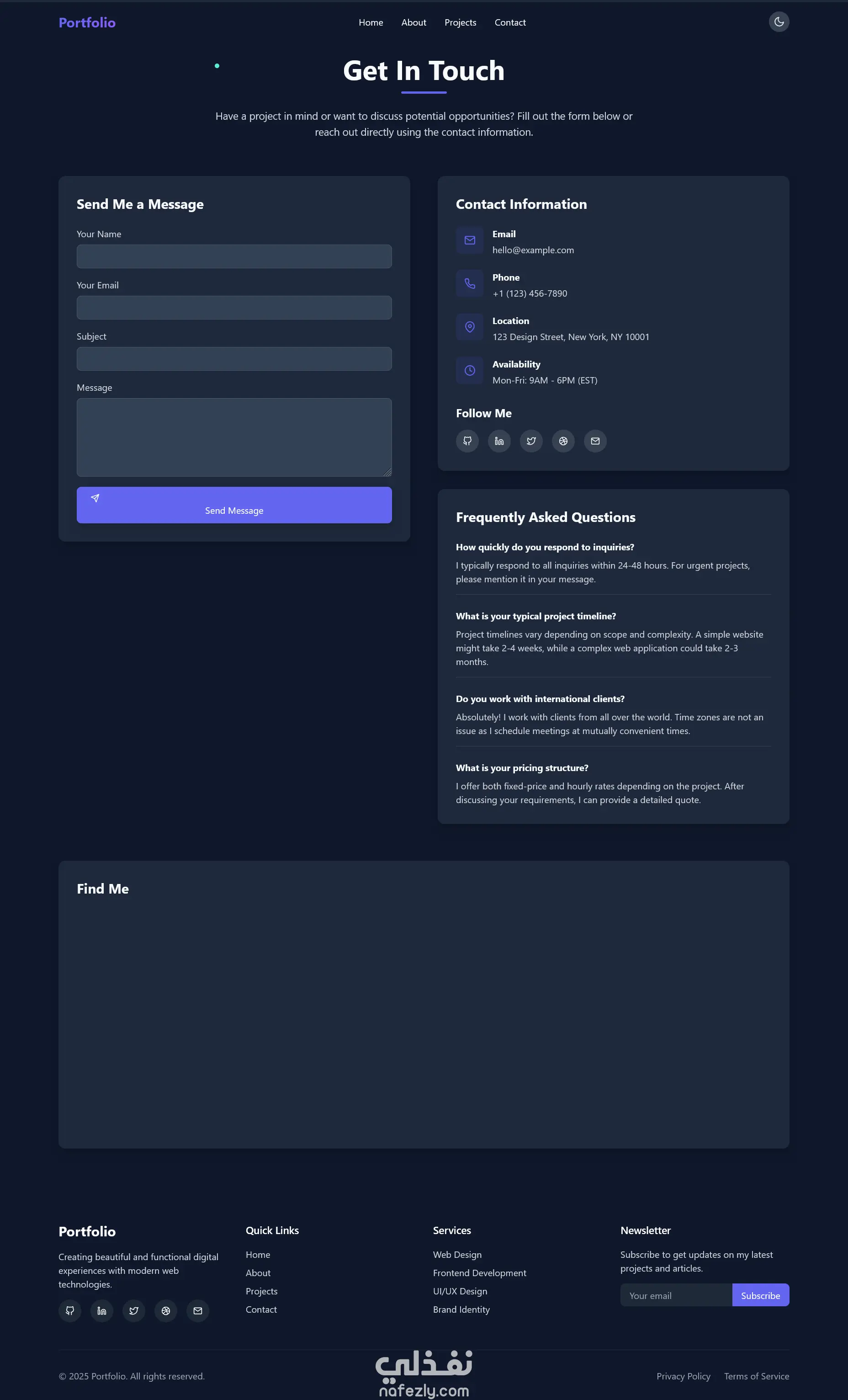 أقسام متكاملة: الرئيسية، من أنا، المشاريع، الخدمات، التواصل