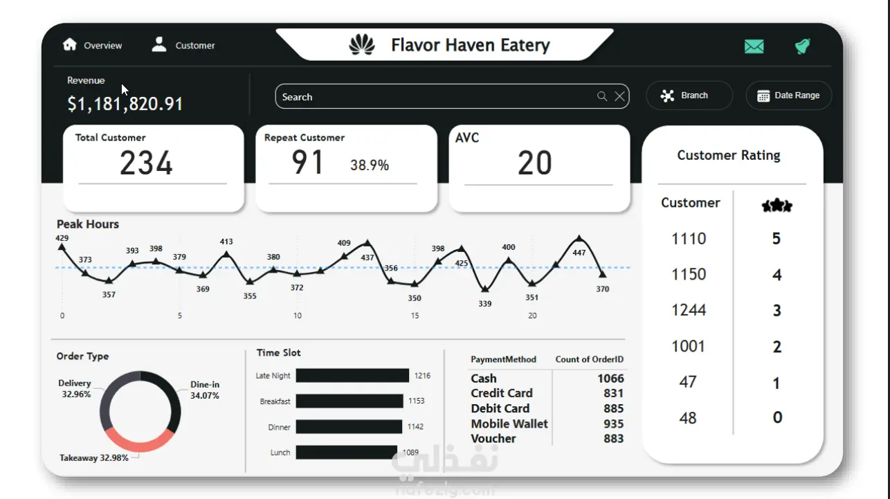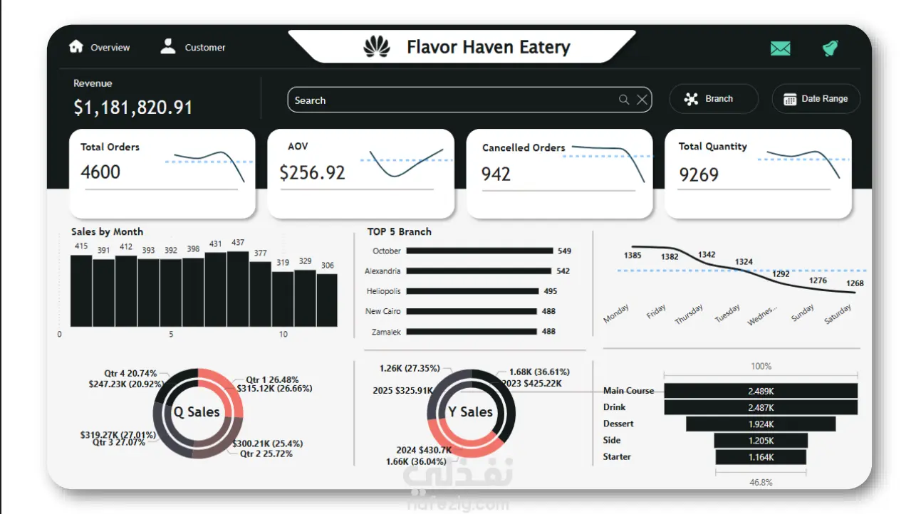 الهدف: تم تصميم هذه اللوحة لتوفير نظرة شاملة على أداء المبيعات، الطلبات، والفروع، بهدف دعم اتخاذ القرار وتحسين العمليات التشغيلية.