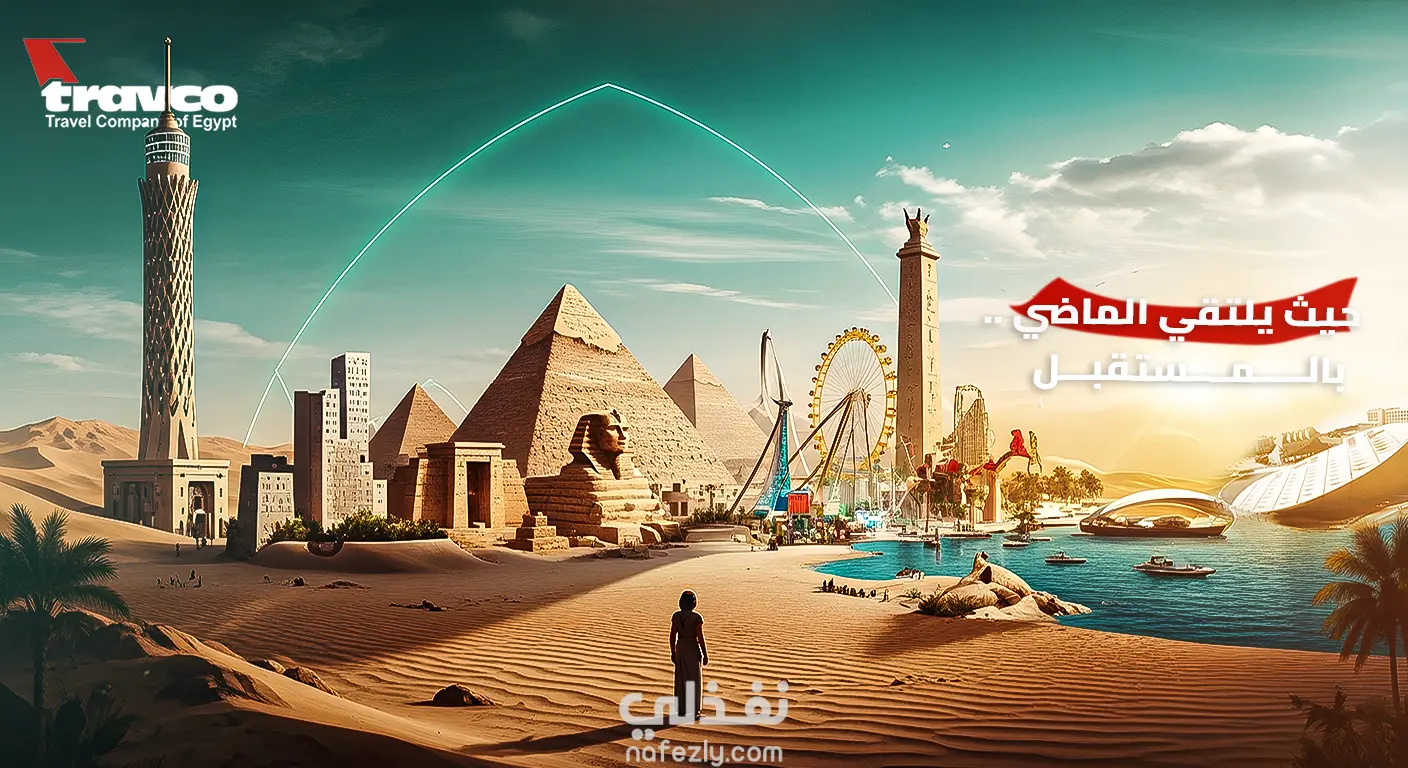تصميم إعلاني احترافي يعكس فخامة وتميز شركة Travco كواحدة من أكبر شركات السياحة في مصر. يركّز التصميم على إبراز الوجهات السياحية الفريدة التي تقدمها الشركة داخل مصر وخارجها، مثل شرم الشيخ، الغردقة، الأقصر، أسوان، ووجهات أوروبية وعربية شهيرة.