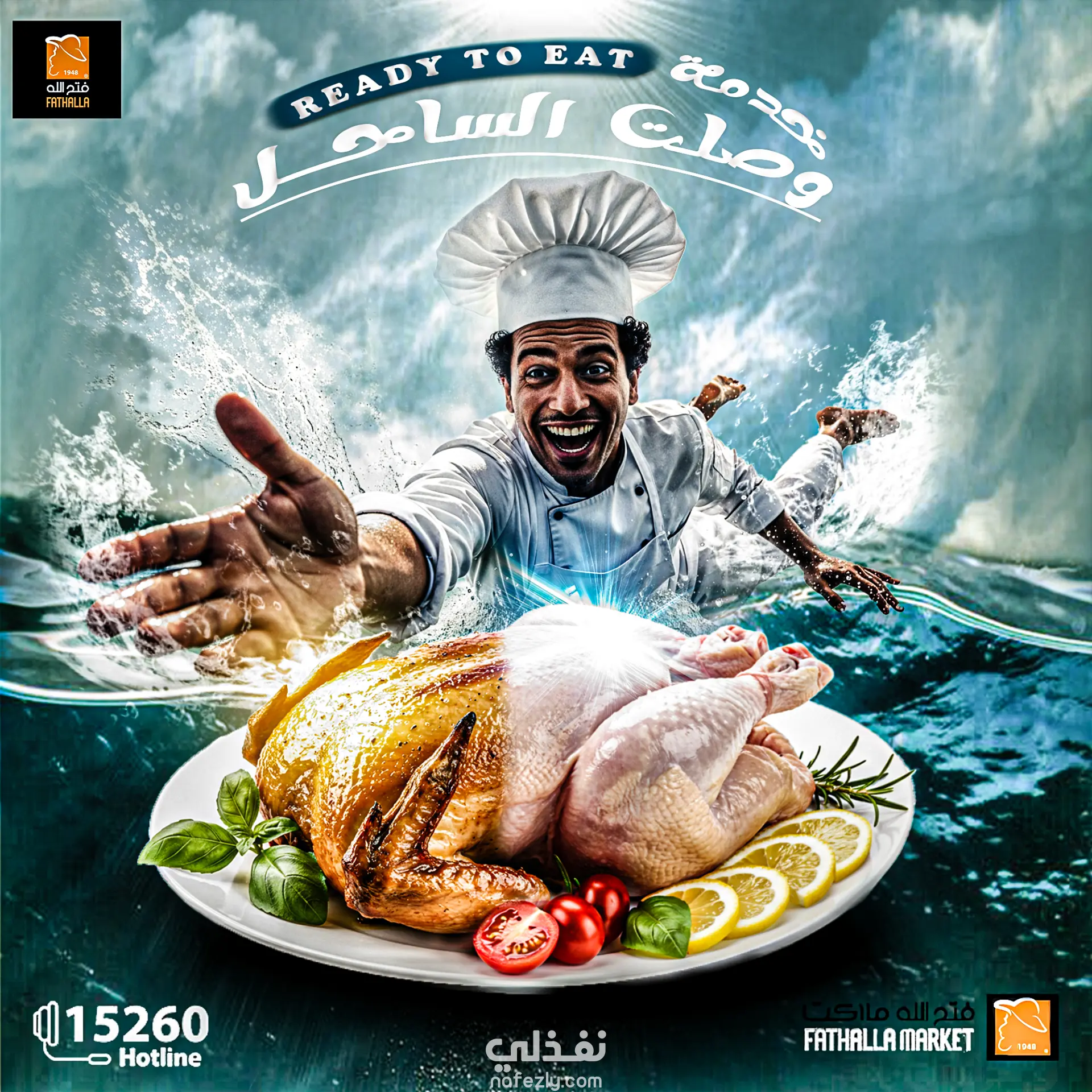تصميم دعائي لخدمة الوجبات الجاهزة الحصرية من أسواق فتح الله في فروع الساحل الشمالي. التصميم يجمع بين الطاقة، والنضارة، والنكهة، ويُظهر شيفًا يغوص في طبق وجبة مثالية تم إعدادها بإتقان، ليعكس فكرة السهولة، والتميز، والمتعة في كل لقمة. الهدف من التصميم هو إبراز راحة العميل في الحصول على وجبات جاهزة طازجة ومذاقها رائع دون عناء، مع الحفاظ على هوية أسواق فتح الله من خلال الألوان الحيوية والعصرية التي تعكس الجودة والثقة.