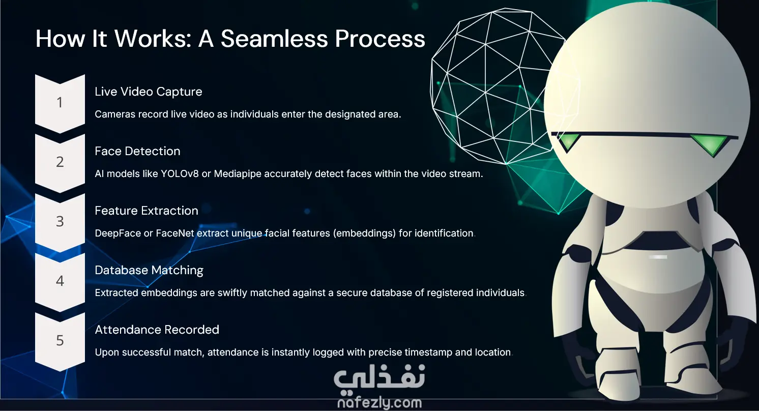 Face Detection: The camera captures live video, and the system detects faces using AI models like MTCNN, Haar Cascade, or YOLO. Detected faces are cropped and preprocessed.