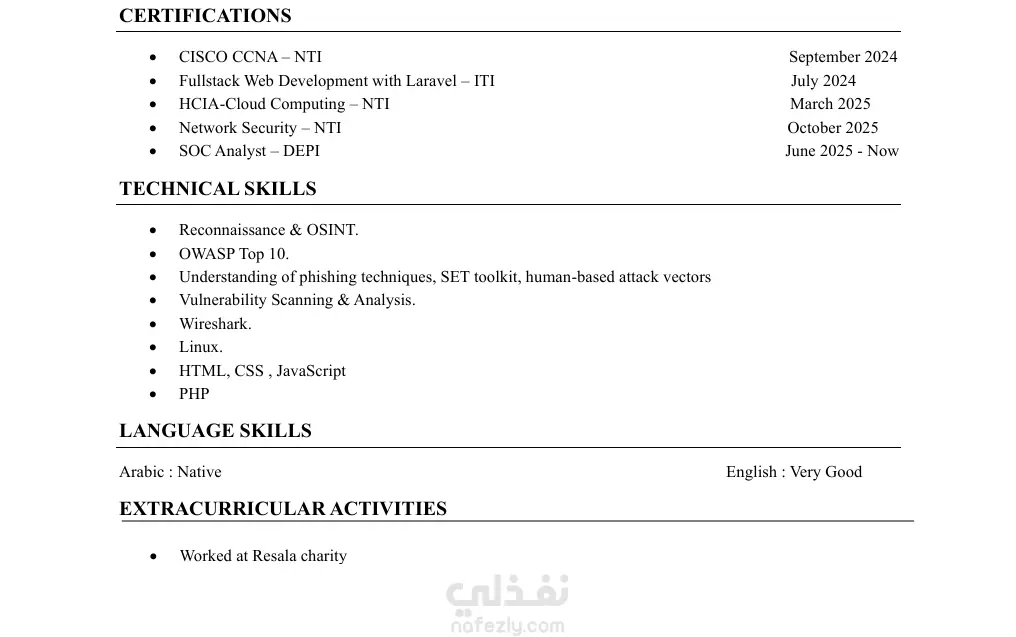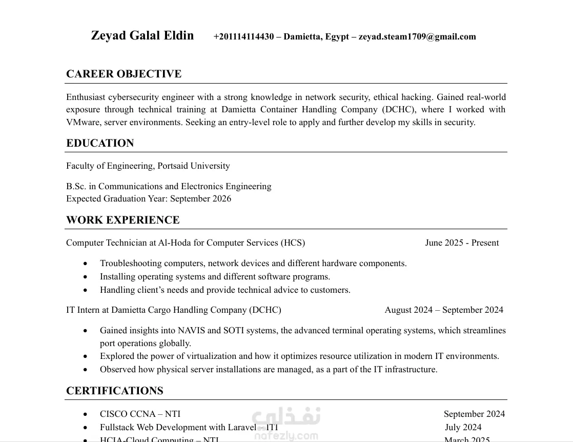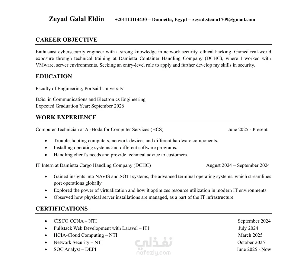 الCV الخاص بيا عملته باختياري الكامل لكل العناصر الاقسام والعناوين الرئيسية وطريقة ملئ المهارات التقنية والشخصية ووافق عليها أكتر من خبير في المهارات الشخصية ، كمان السيرة الذاتيه لطالب بتختلف بشكل بسيط شوية عن سيرة ذاتية حد متخرج وبيشتغل بالفعل ، بتحتوي علي : 1- نبذة بسيطة عن مجال العمل 2- التعليم 3- الخبرة العملية ( من تدريبات او ما شابه ) 4- الشهادات الموثقة التابعه لمجال العمل 5- المهارات التقنية 6- اللغات 7- بعض الاعمال التطوعية
